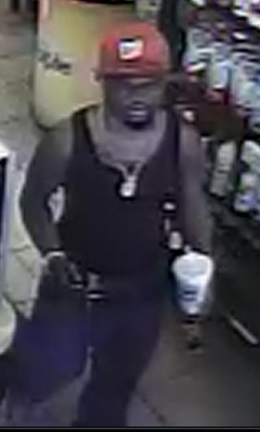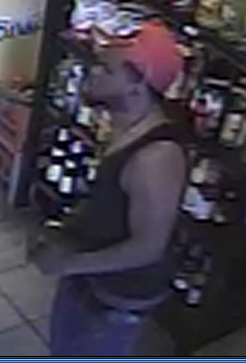 The suspect depicted in the surveillance photos is a black male, 5’08”-5’10” tall, 150-175 lbs., wearing white tank top and blue jeans.