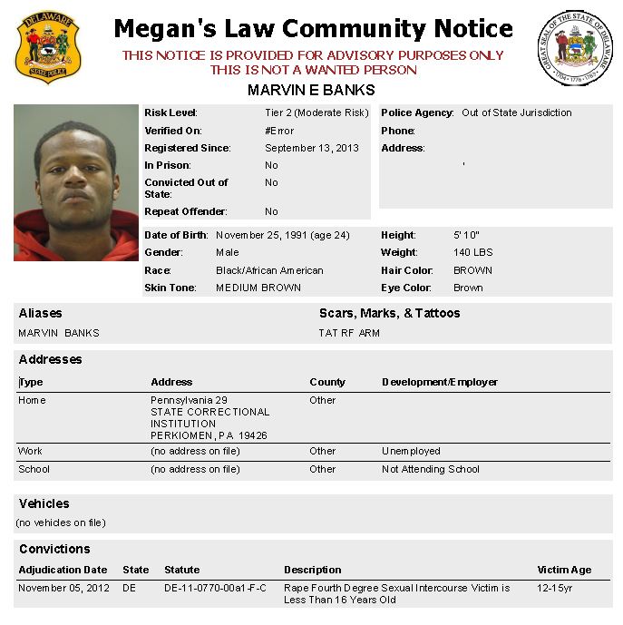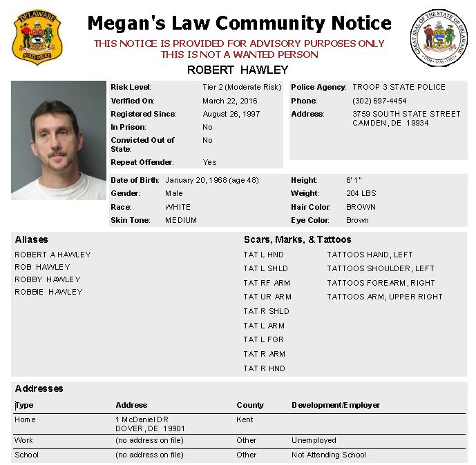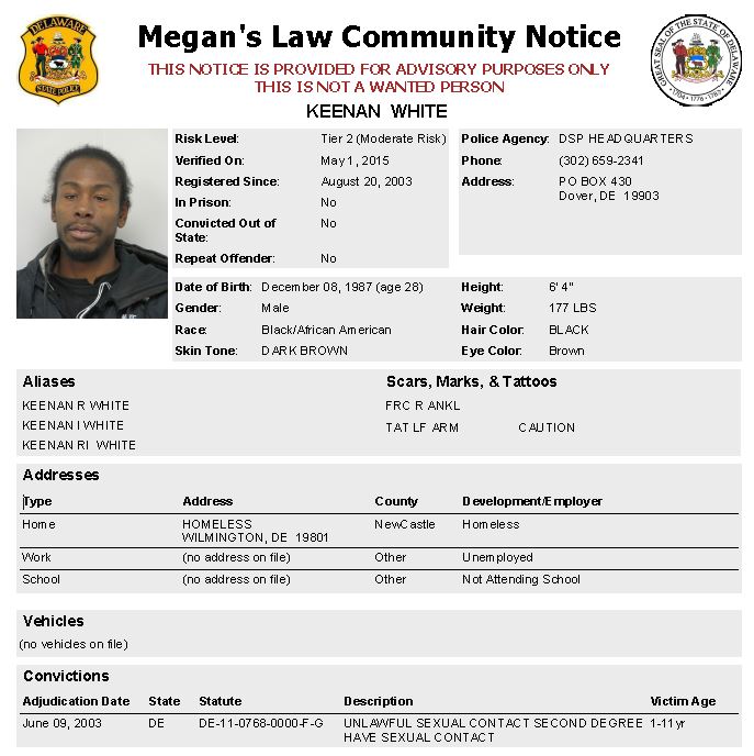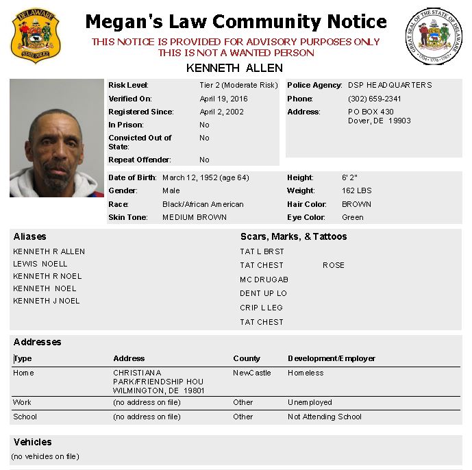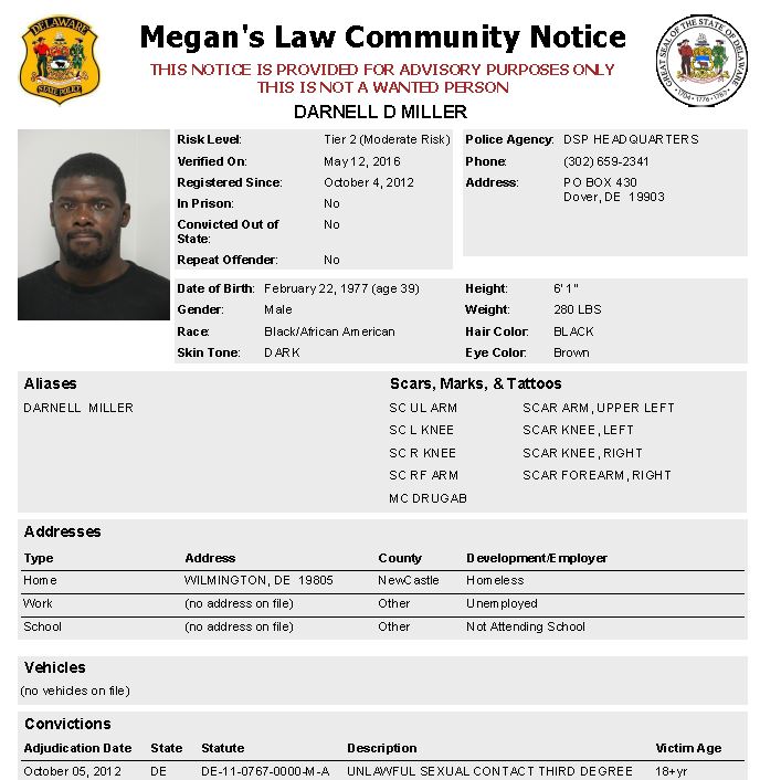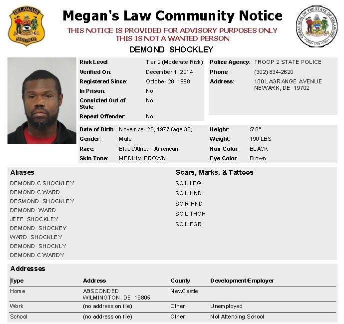 Dover, DE- The Delaware State Police Sex Offender Apprehension and Registration Unit (S.O.A.R) is currently looking for the following wanted sex offender after they either failed to register or re-register their current address. If anyone knows the location of any of the subjects, they are asked to call 302-672-5306. Information may also be provided by calling Delaware Crime Stoppers at 1-800-TIP-3333, via the internet at www.delaware.crimestoppersweb.com, or by sending an anonymous tip by text to 274637 (CRIMES) using the keyword “DSP.”