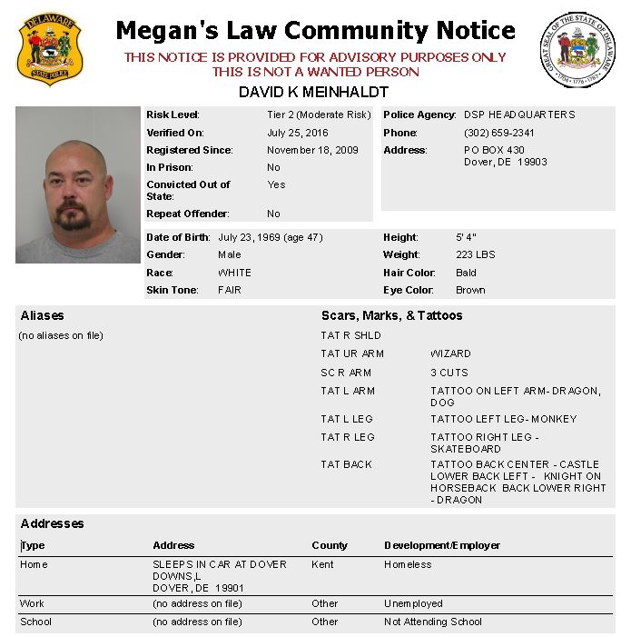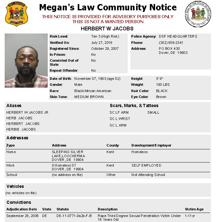 Dover– The following are not wanted. This is a Homeless Sex Offender Public Notification. If you have information that any of the listed subjects are occupying a residence, please call 302-672-5306. Information may also be provided by calling Delaware Crime Stoppers at 1-800-TIP-3333, via the internet at www.delaware.crimestoppersweb.com or by sending an anonymous tip by text to 274637 (CRIMES) using the keyword “DSP.”