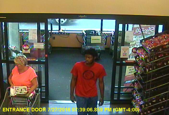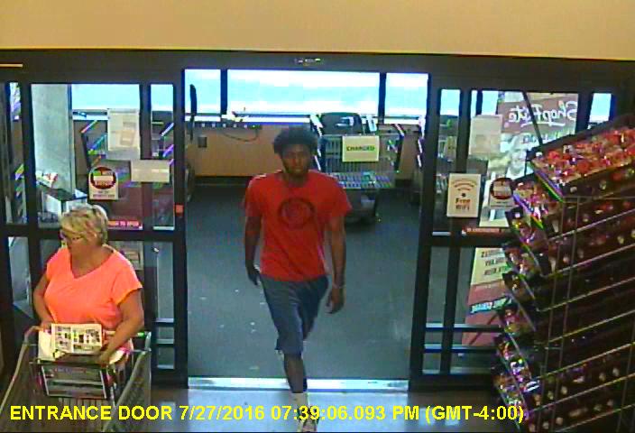 The male suspect who displayed the weapon (pictured in red shirt) is described as a black male. He was 25-30 years of age, 6’01”-6’04” tall, 170-180 lbs. and had a thin build.
