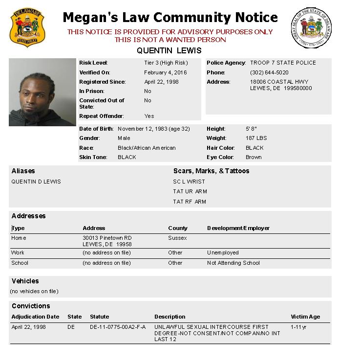 Lewes, DE- The Delaware State Police Sex Offender Apprehension and Registration Unit (S.O.A.R) is currently looking for Quentin D. Lewis, 32 of Lewes, after he either failed to register or re-register his current address. Lewis is a Tier 3 (High Risk) sex offender who is also wanted by Troop 4 Major Crimes Detectives for two incidents of domestic assault as well as two capiases out of Kent County courts.
