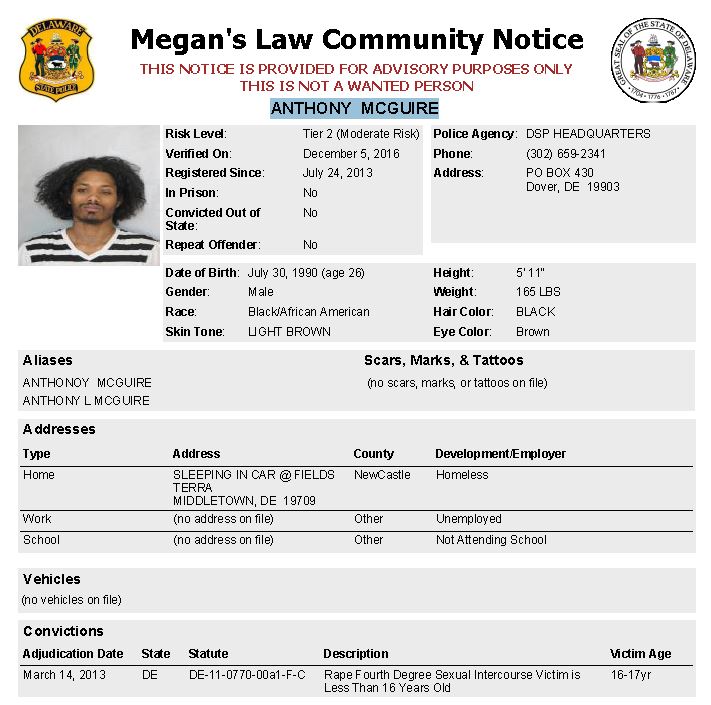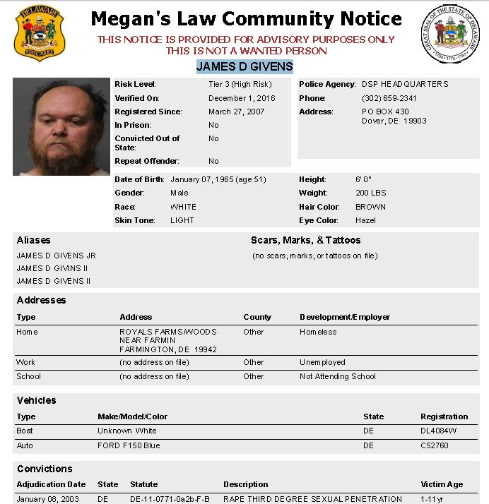 Dover– The following are not wanted. This is a Homeless Sex Offender Public Notification. If you have information that any of the listed subjects are occupying a residence, please call 302-672-5306. Information may also be provided by calling Delaware Crime Stoppers at 1-800-TIP-3333, via the internet at http://www.delaware.crimestoppersweb.com or by sending an anonymous tip by text to 274637 (CRIMES) using the keyword “DSP.”