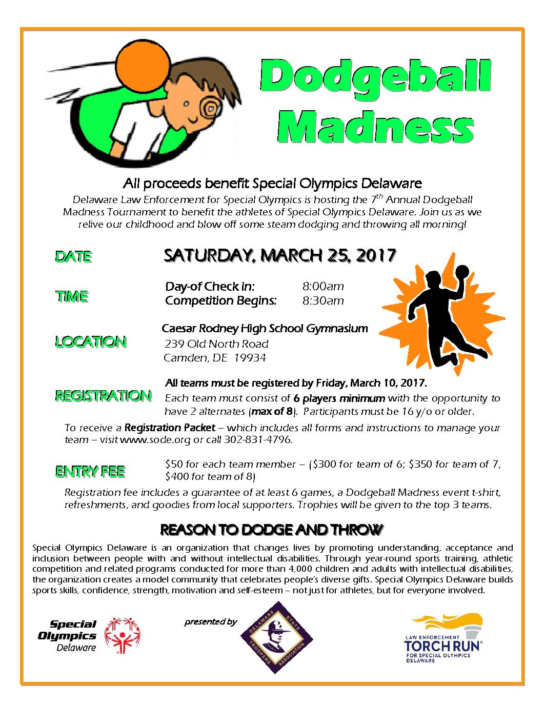Deadline to register is Friday, March 10, 2017. There are three ways to register for the event, please visit the Special Olympics Delaware website at www.sode.org, online registration by clicking on the following link: https://give.classy.org/dodgeball2017, or call Special Olympics Delaware (302)831-4796.