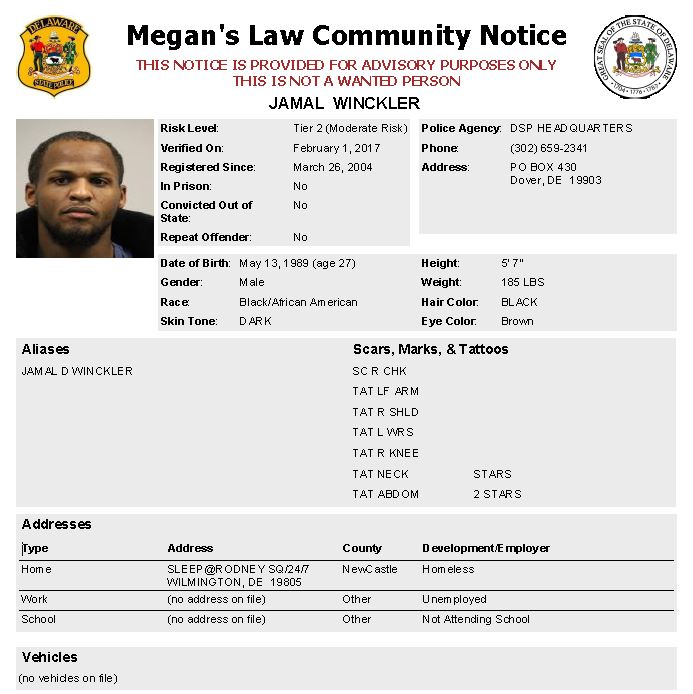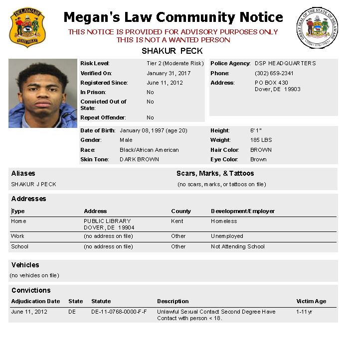 Dover– The following are not wanted. This is a Homeless Sex Offender Public Notification. If you have information that any of the listed subjects are occupying a residence, please call 302-672-5306. Information may also be provided by calling Delaware Crime Stoppers at 1-800-TIP-3333, via the internet at http://www.delaware.crimestoppersweb.com or by sending an anonymous tip by text to 274637 (CRIMES) using the keyword “DSP.”