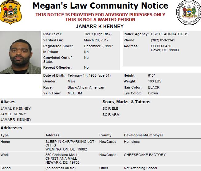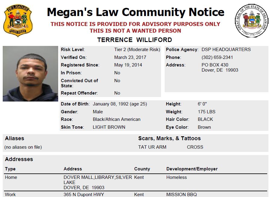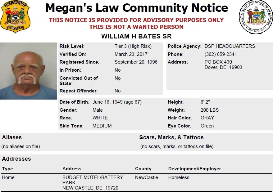 Dover– The following are not wanted. This is a Homeless Sex Offender Public Notification. If you have information that any of the listed subjects are occupying a residence, please call 302-672-5306. Information may also be provided by calling Delaware Crime Stoppers at 1-800-TIP-3333, via the internet at http://www.delaware.crimestoppersweb.com or by sending an anonymous tip by text to 274637 (CRIMES) using the keyword “DSP.”