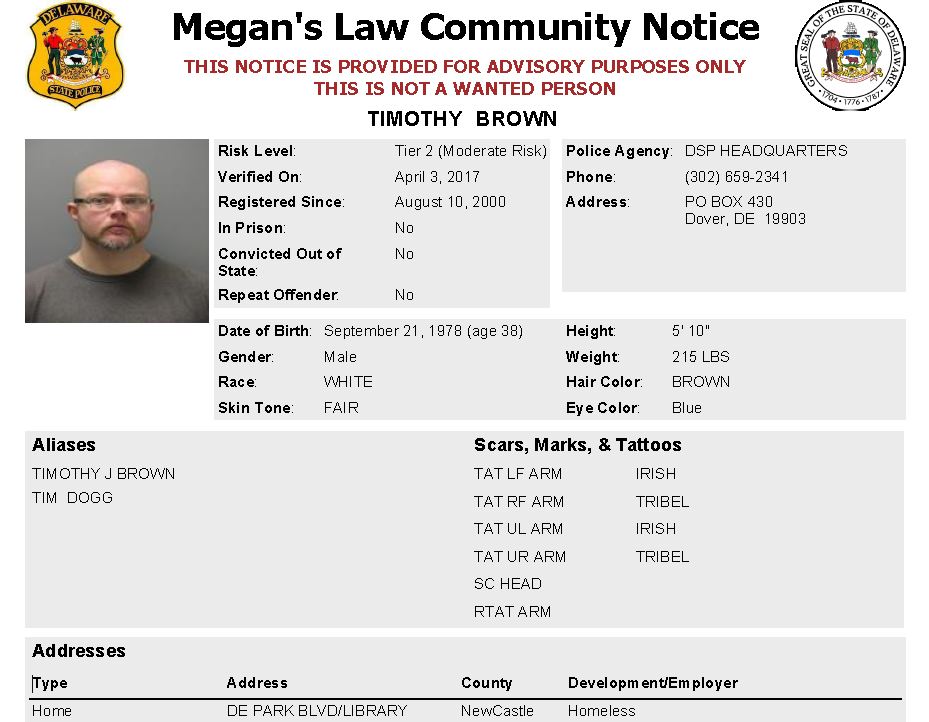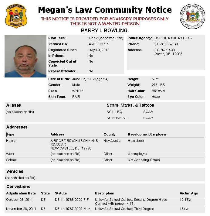 Dover– The following are not wanted. This is a Homeless Sex Offender Public Notification. If you have information that any of the listed subjects are occupying a residence, please call 302-672-5306. Information may also be provided by calling Delaware Crime Stoppers at 1-800-TIP-3333, via the internet at http://www.delaware.crimestoppersweb.com or by sending an anonymous tip by text to 274637 (CRIMES) using the keyword “DSP.”