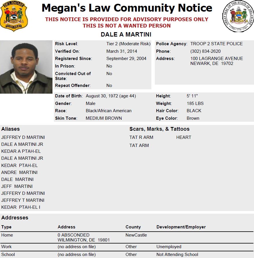 Investigators have obtained a warrant for Dale A. Martini, 44 of Wilmington. Martini, a Tier 2 (Moderate Risk) sex offender, is a black male, 5’11” tall, 185 lbs., with black hair and brown eyes. Click or copy and paste the link to view profile and download mug shot: https://sexoffender.dsp.delaware.gov/Poster/00000773