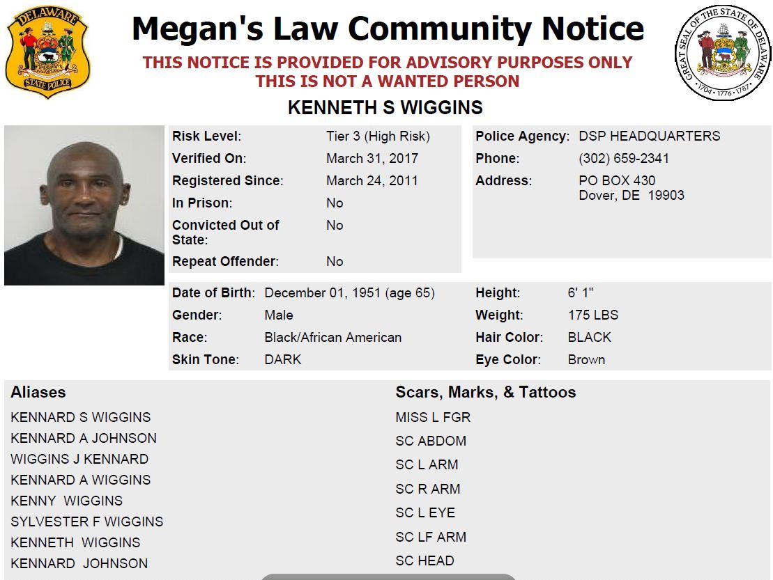 Investigators have obtained a warrant for Kenneth S. Wiggins, 65 of Wilmington. Wiggins, a Tier 3 (High Risk) sex offender, is a black male, 6’01” tall, 175 lbs., with black hair or bald and brown eyes. Click or copy and paste the link to view profile and download mug shot: https://sexoffender.dsp.delaware.gov/Poster/00005351
