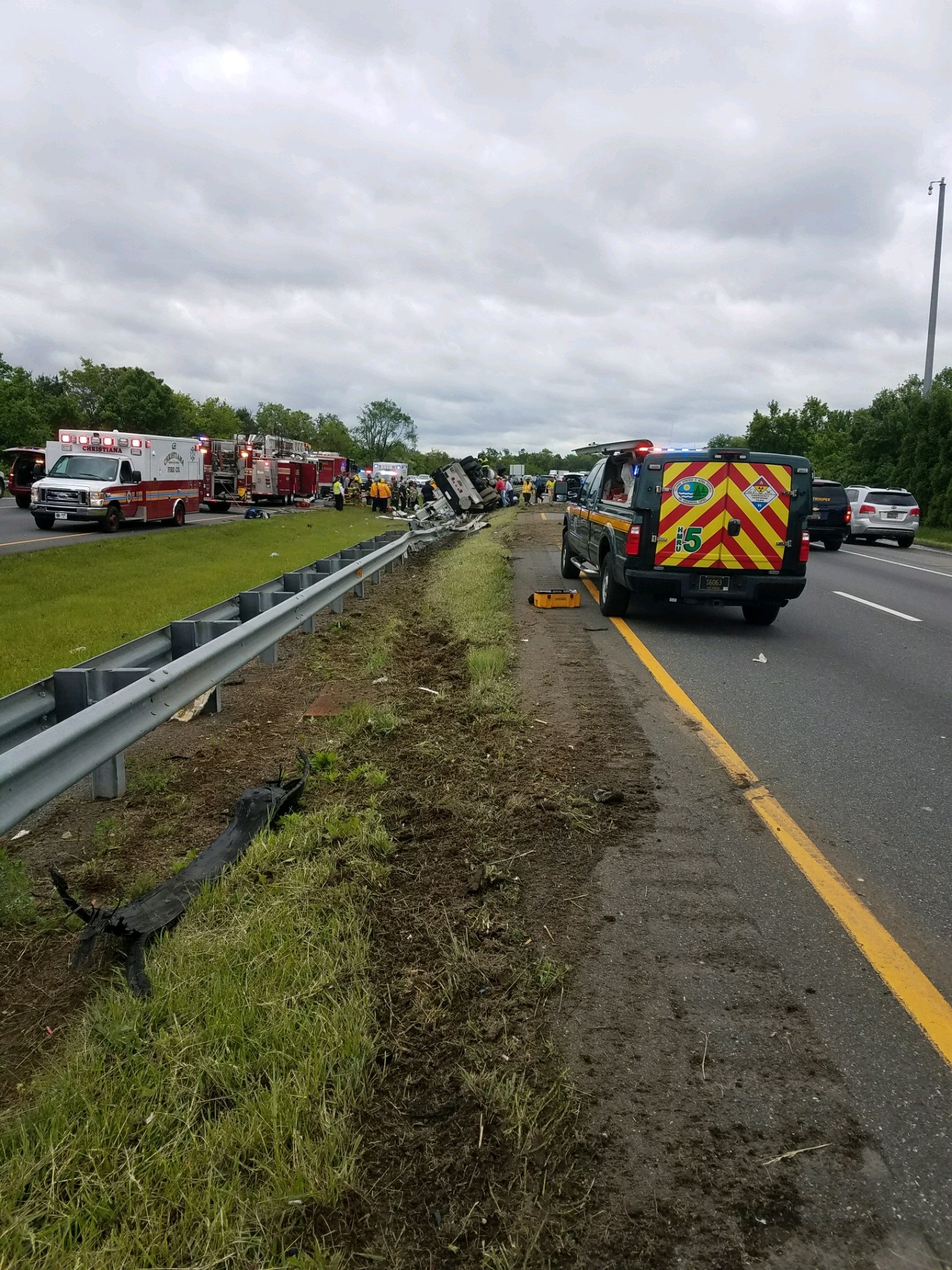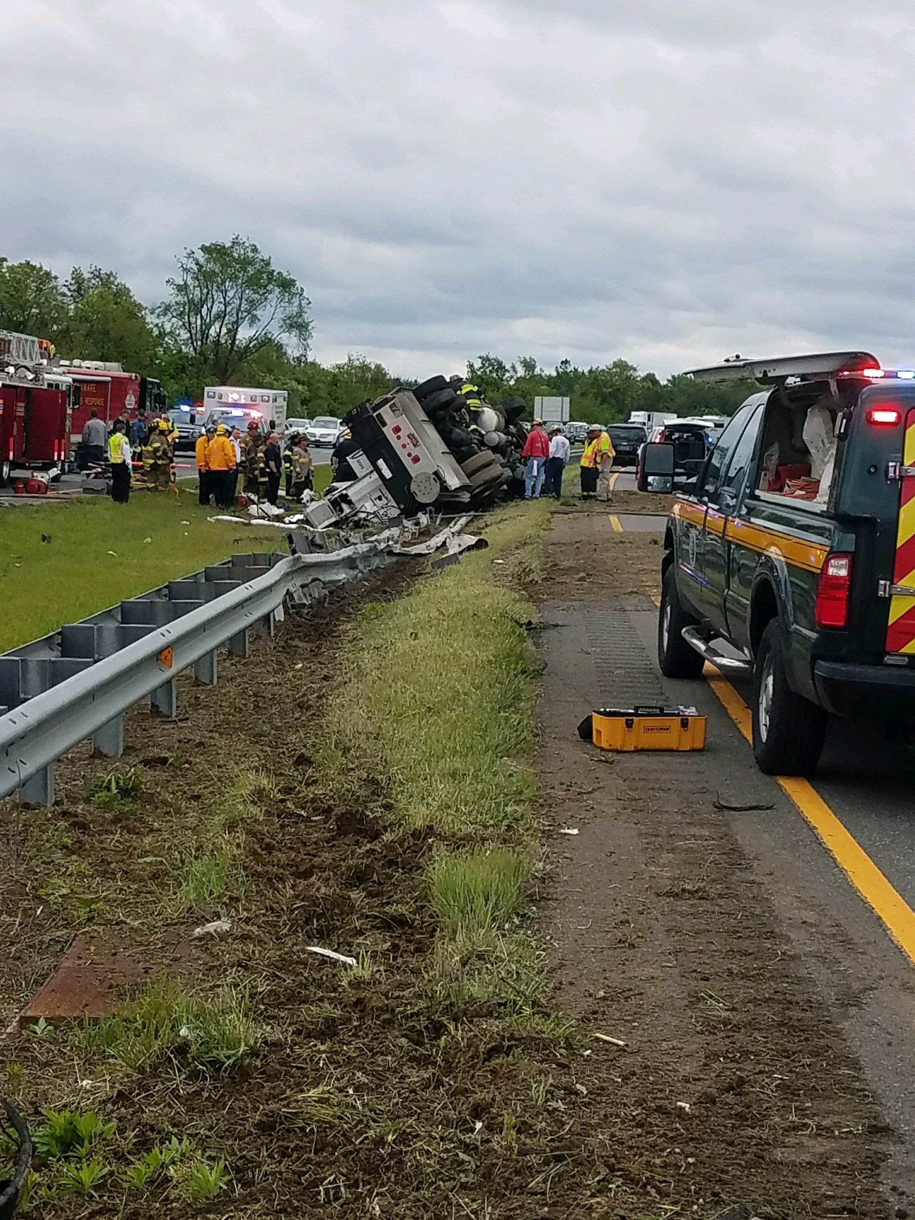 The initial investigation has determined the incident occurred at approximately 7:46 a.m. today, Saturday, May 6, 2017 as troopers responded to the area of SR 1 between Rt. 273 and SR 40. A tractor trailer was traveling southbound on SR 1 and for unknown reasons flipped over onto the driver’s side onto a metal guardrail and grass median. The driver is entrapped in the cab and emergency EMS is on the scene working to extract the driver. The tractor is a Peterbilt three axle truck with a crane body single unit.