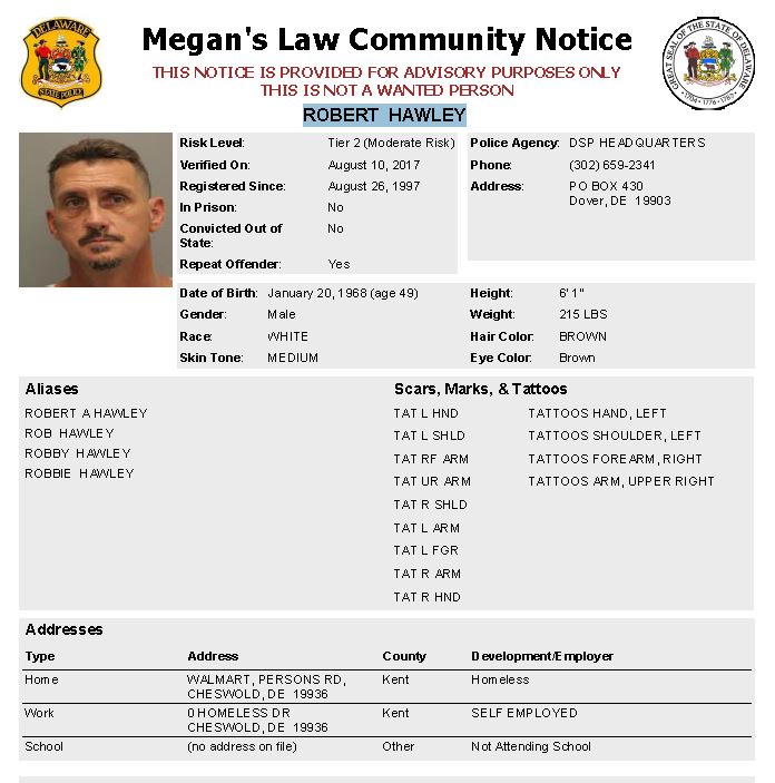 DoverThe following are not wanted.   This is a Homeless Sex Offender Public Notification.  If you have information that any of the listed subjects are occupying a residence, please call 302-672-5306.  Information may also be provided by calling Delaware Crime Stoppers at 1-800-TIP-3333, via the internet at http://www.delaware.crimestoppersweb.com.