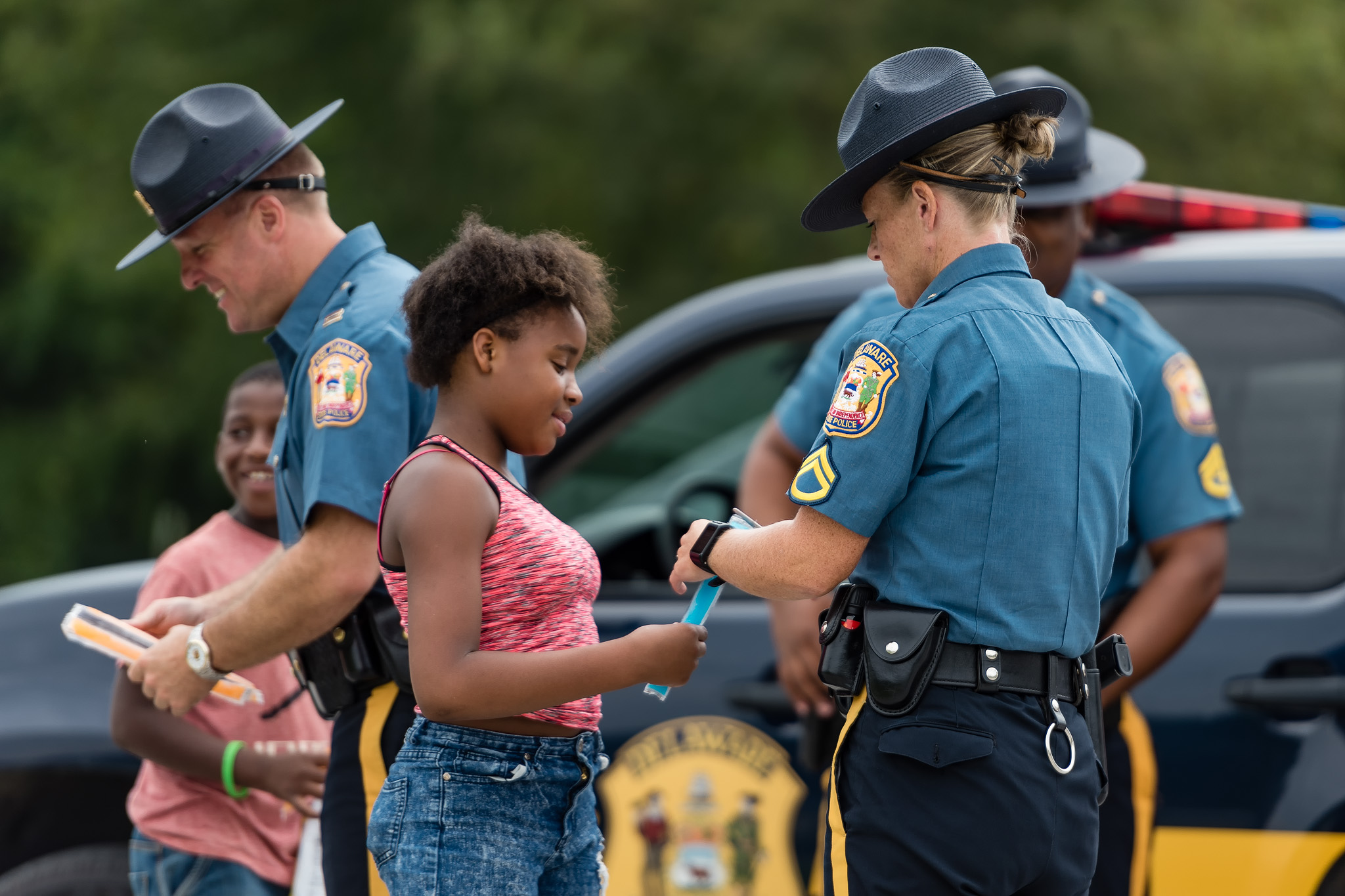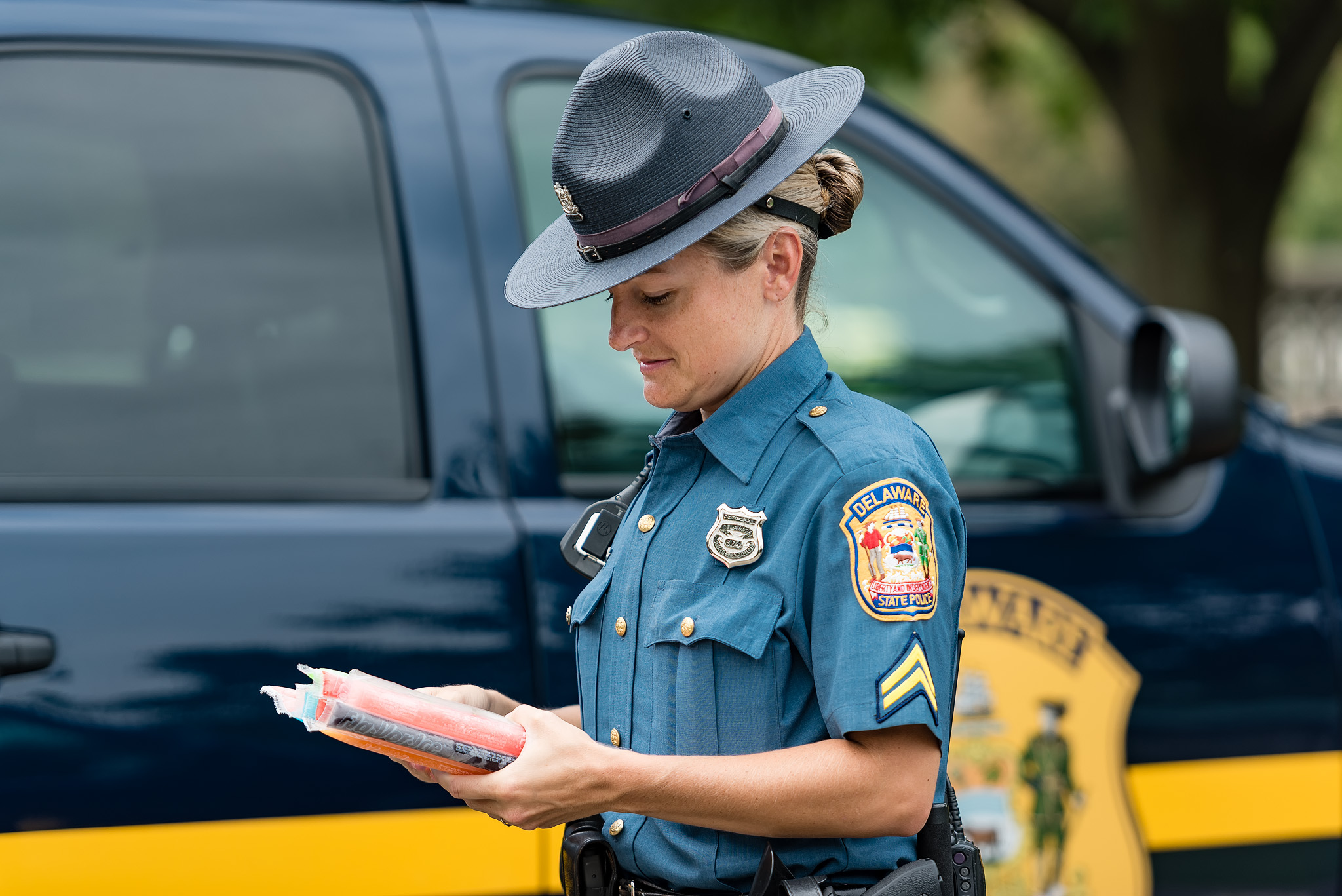 “I’m very proud of the wonderful initiative that was undertaken today within the communities across Kent County. The men and women of the Delaware State Police Troop 3 in conjunction with the Delaware State police Community Outreach Unit and the Mounted Patrol unit along with our honorary commanders distributed ice pops to children and their families sending the positive message that’s ‘it’s cool to go back to school’. A great example of the community and police working together to strengthen our community” said, Captain Joshua Bushweller, Troop 3, Troop Commander.