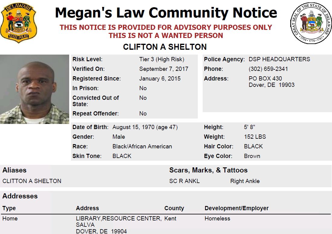 Dover– The following are not wanted. This is a Homeless Sex Offender Public Notifications. If you have information the listed subjects are occupying a residence, please call 302-672-5306. Information may also be provided by calling Delaware Crime Stoppers at 1-800-TIP-3333, via the internet at http://www.delaware.crimestoppersweb.com.