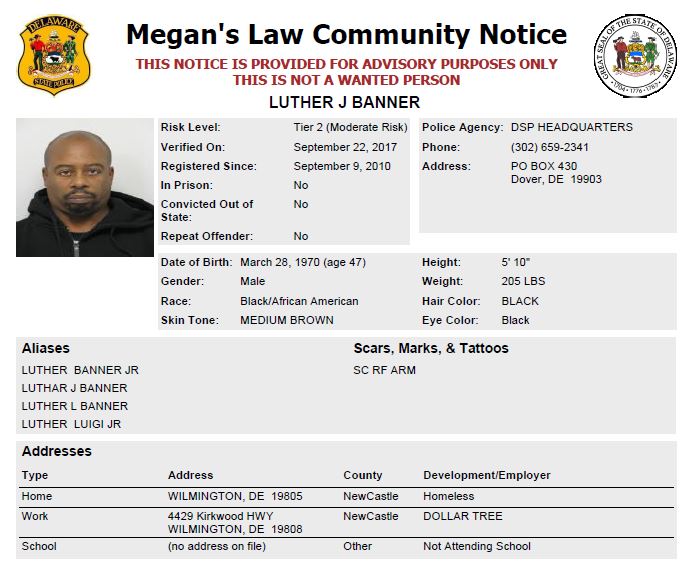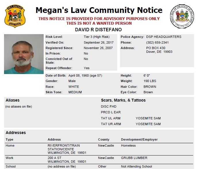 Dover– The following are not wanted. This is a Homeless Sex Offender Public Notification. If you have information that any of the listed subjects are occupying a residence, please call 302-672-5306. Information may also be provided by calling Delaware Crime Stoppers at 1-800-TIP-3333, via the internet at http://www.delaware.crimestoppersweb.com.