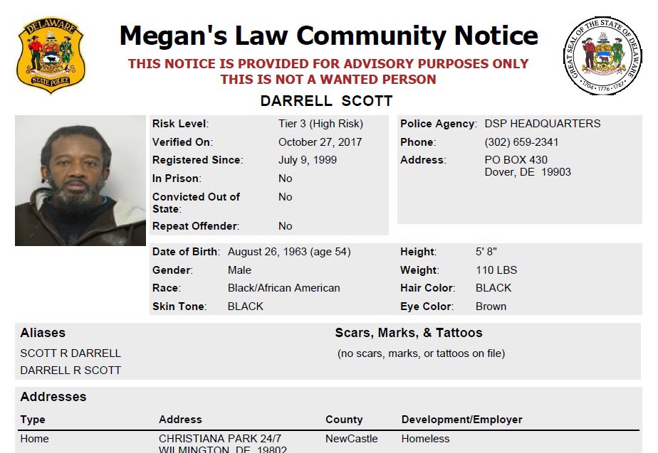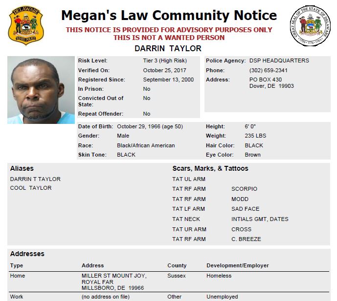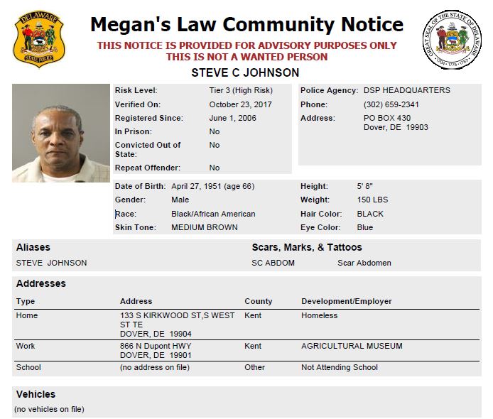 Dover– The following are not wanted. This is a Homeless Sex Offender Public Notification. If you have information that any of the listed subjects are occupying a residence, please call 302-672-5306. Information may also be provided by calling Delaware Crime Stoppers at 1-800-TIP-3333, via the internet at http://www.delaware.crimestoppersweb.com.