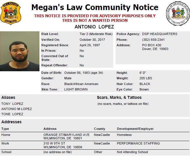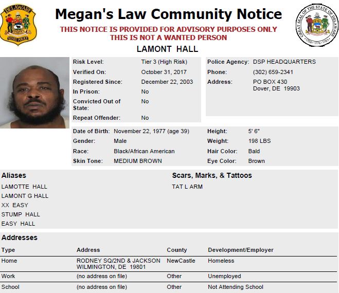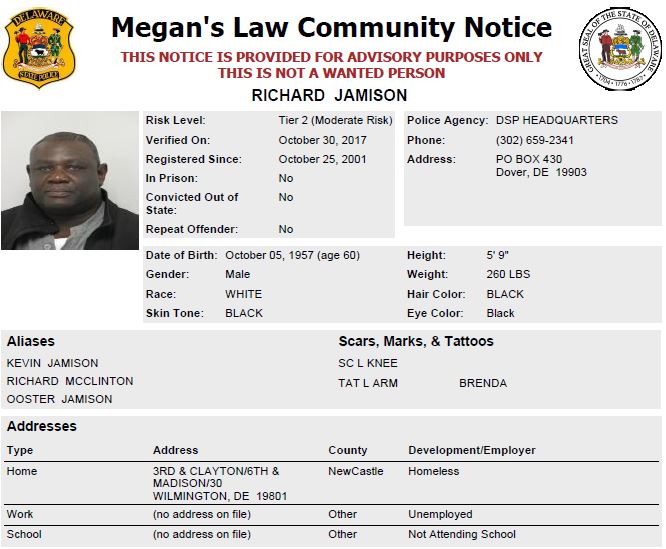 DoverThe following are not wanted.   This is a Homeless Sex Offender Public Notification.  If you have information that any of the listed subjects are occupying a residence, please call 302-672-5306.  Information may also be provided by calling Delaware Crime Stoppers at 1-800-TIP-3333, via the internet at http://www.delaware.crimestoppersweb.com.
