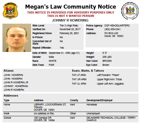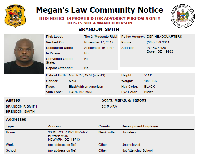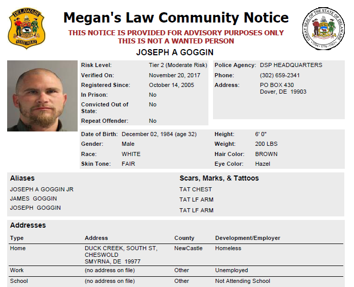 Dover– The following are not wanted. This is a Homeless Sex Offender Public Notification. If you have information that any of the listed subjects are occupying a residence, please call 302-672-5306. Information may also be provided by calling Delaware Crime Stoppers at 1-800-TIP-3333, via the internet at http://www.delaware.crimestoppersweb.com.