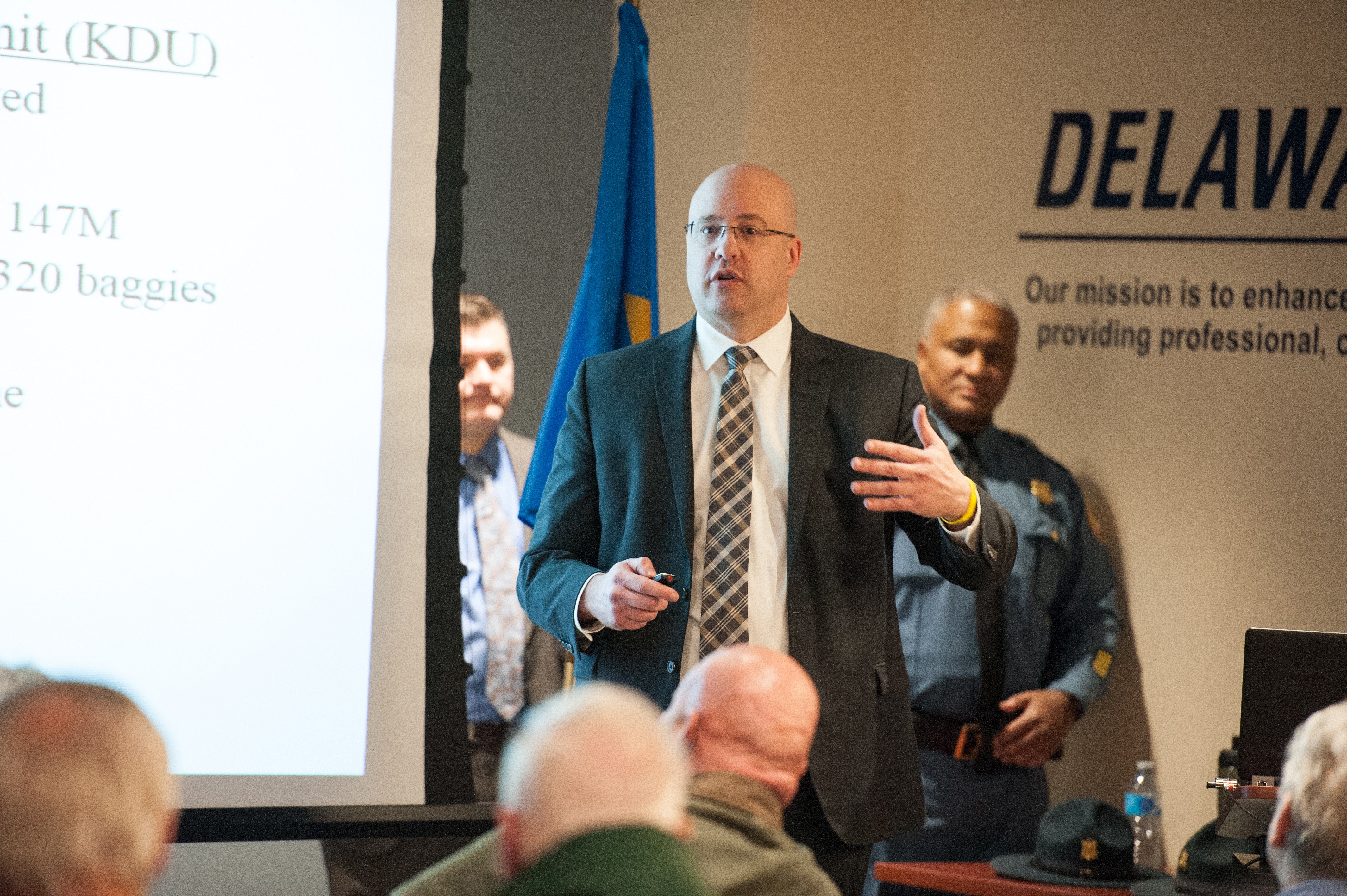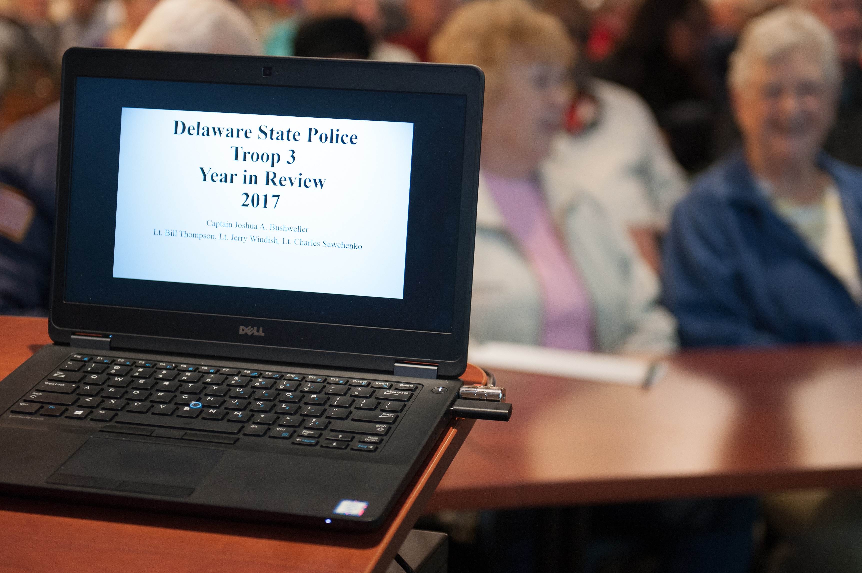 The Delaware State Police Troop 3 Administration held a community meeting on Thursday, February 1, 2018 at the Troop located at 3759 South State Street, Camden. Troopers were privileged to have hosted a Town Hall Meeting where the public was provided with an overview of the great work done by the men and women of DSP Troop 3 in 2017. Achieving a 35.7% reduction in Robberies, a 20.8% reduction in Burglaries, a 16.7% reduction in Thefts, as well as a 3.4% reduction in overall crashes simply exemplifies the exceptional work the troopers are doing. Moreover, when you examine many of our clearance rates of crime against the national averages, we demonstrate a deep desire to solve our crime. A Robbery clearance rate of 61.1% versus the national average of 29.3%, a Burglary clearance rate of 39.4% versus the national average of 13.1%, and a Theft clearance rate of 42% versus the national average of 20.4% clearly shows the dedication of our troopers to solve crime when it occurs.
