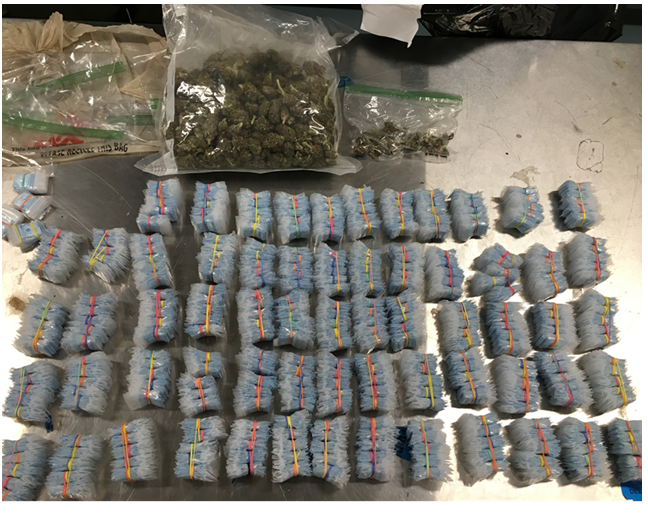 During a search of the residence, a Smith and Wesson rifle, 3 loaded rifle magazines with numerous rifle ammunition, 4,147 blue wax bags of suspected Heroin (approximately 29.029 grams), approximately 276.4 grams of Marijuana, and numerous drug paraphernalia items were recovered.