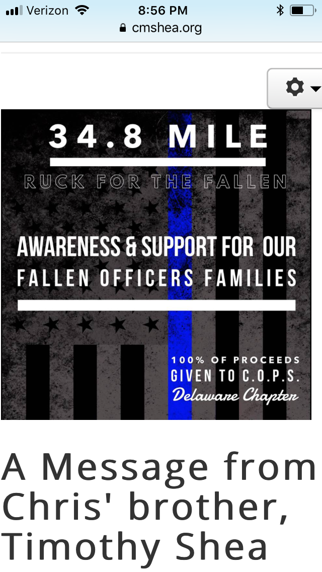 Delaware – Tim Shea wanted to serve the memory of his brother, Christopher, and try to come up with ways to support families of police survivors. Since today, July 18th 2018 marked the 14th anniversary of his brother’s End of Watch, he came up with a “crazy idea to ruck 34.8 miles” since his brother’s badge number was 348. He carried a minimum of 14 pounds – one pound for every year without his brother. This morning Tim Shea started his journey and travelled on foot from DSP Headquarters in Dover to Troop 5 in Bridgeville. The idea was to make this a fundraiser for the Concerns of Police Survivors Delaware Chapter, an organization that has helped many families who had to endure the loss of a loved one in the line of duty. Find out more about his story and visit: www.cmshea.org/ruck