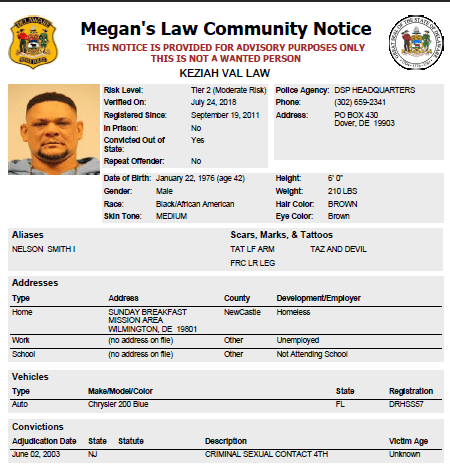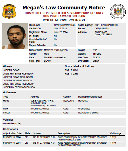 Dover– The following are not wanted. These are Homeless Sex Offender Public Notifications. If you have information that any of the listed subjects are occupying a residence, please call 302-672-5306. Information may also be provided by calling Delaware Crime Stoppers at 1-800-TIP-3333, via the internet at http://www.delaware.crimestoppersweb.com.