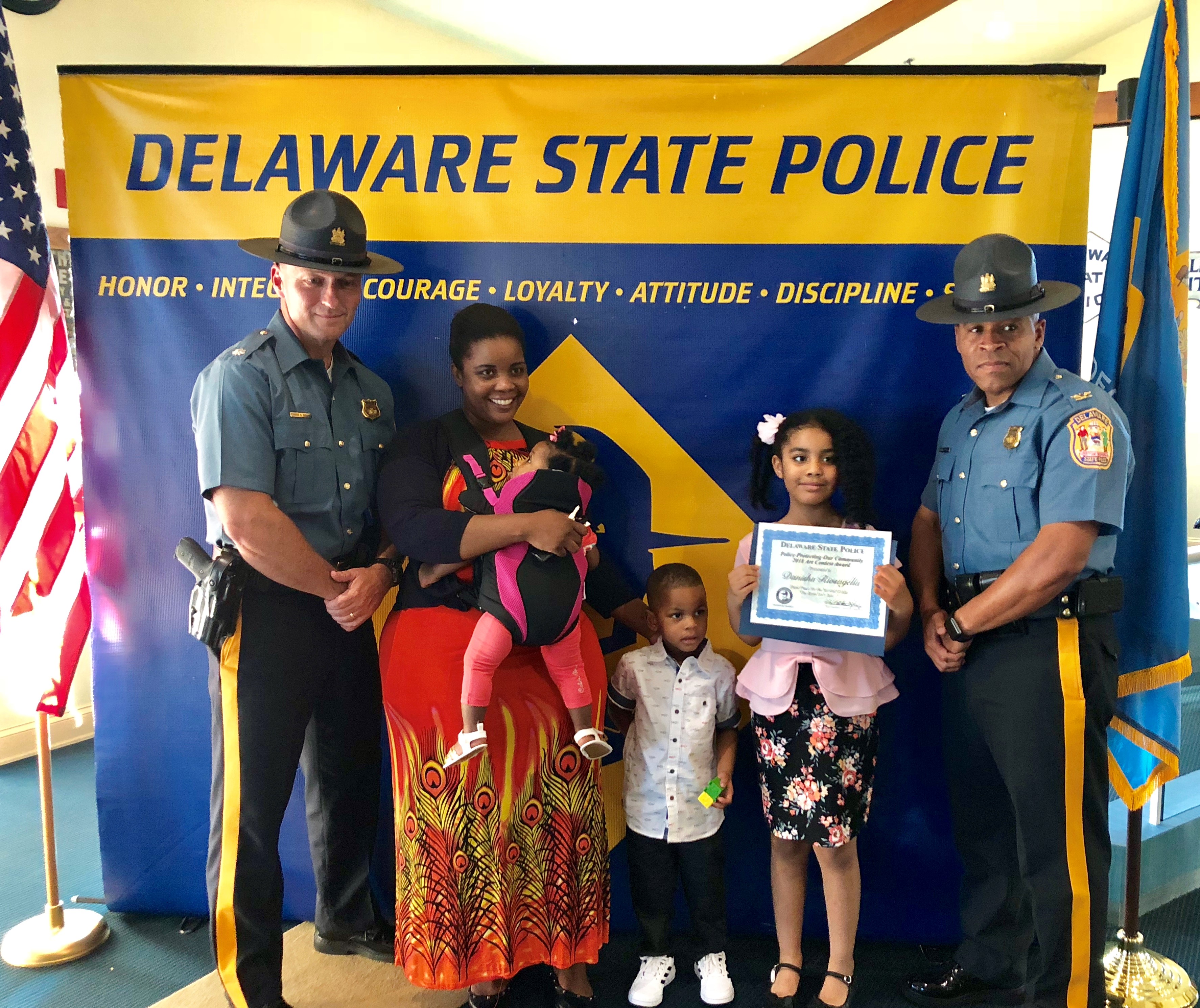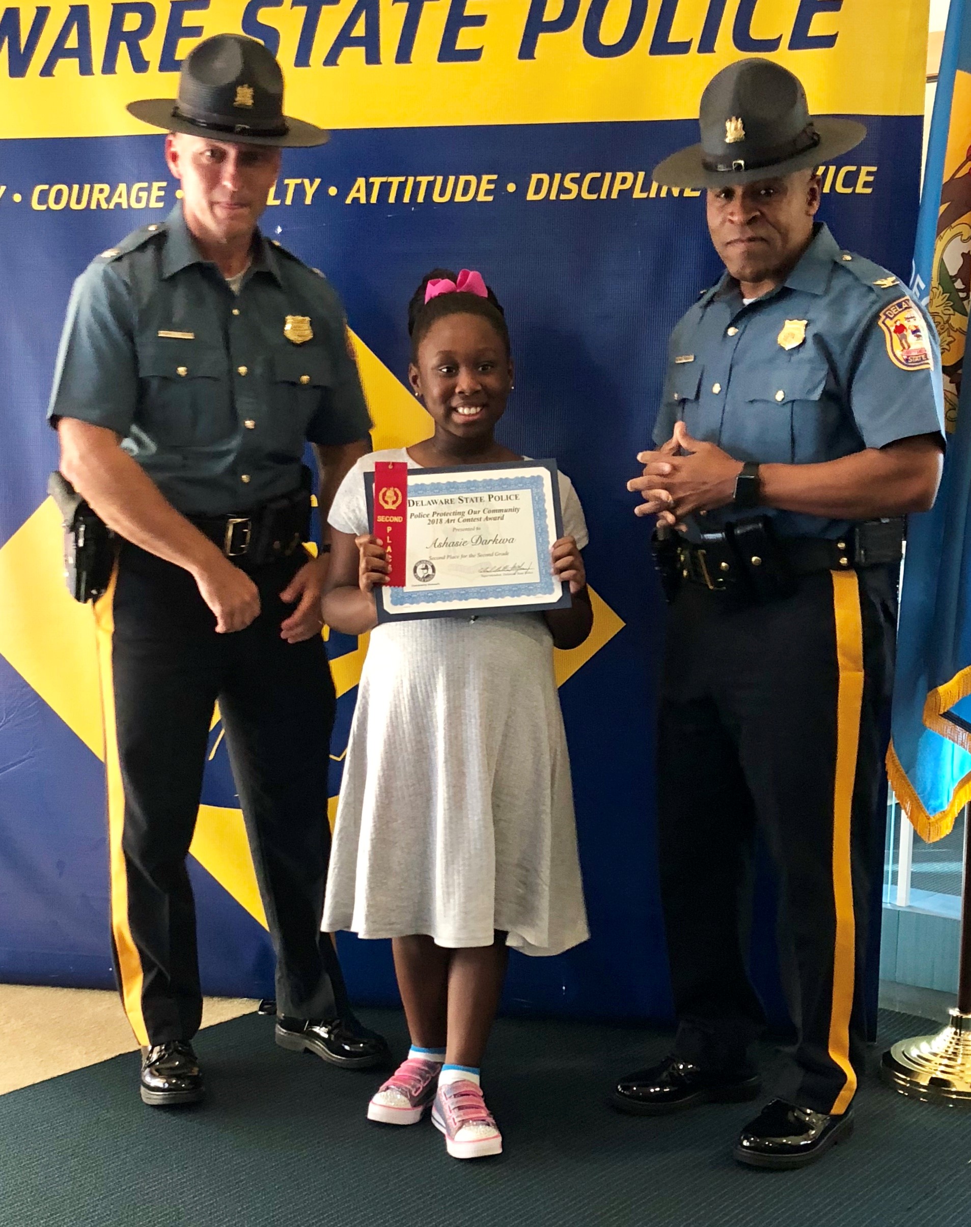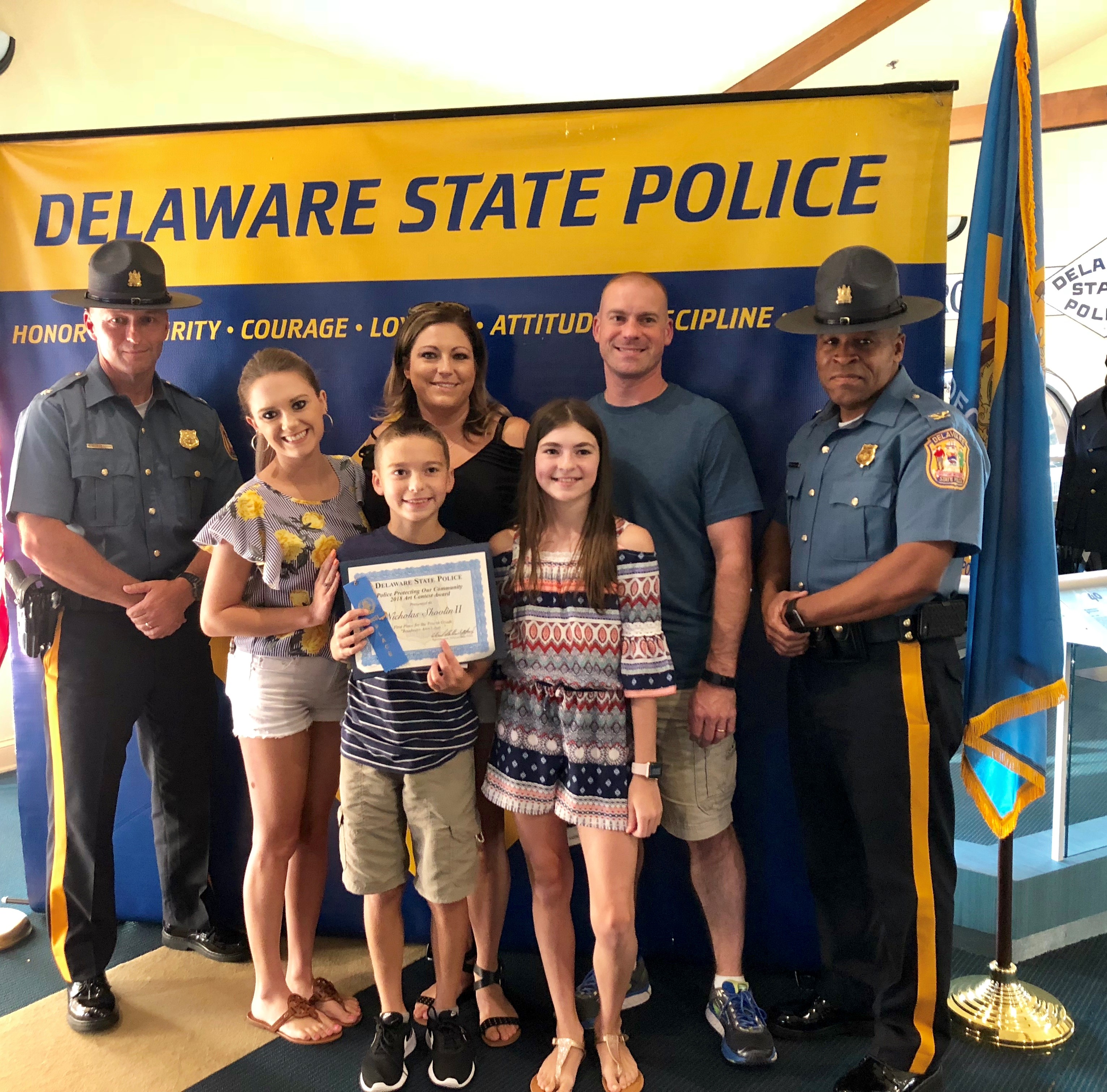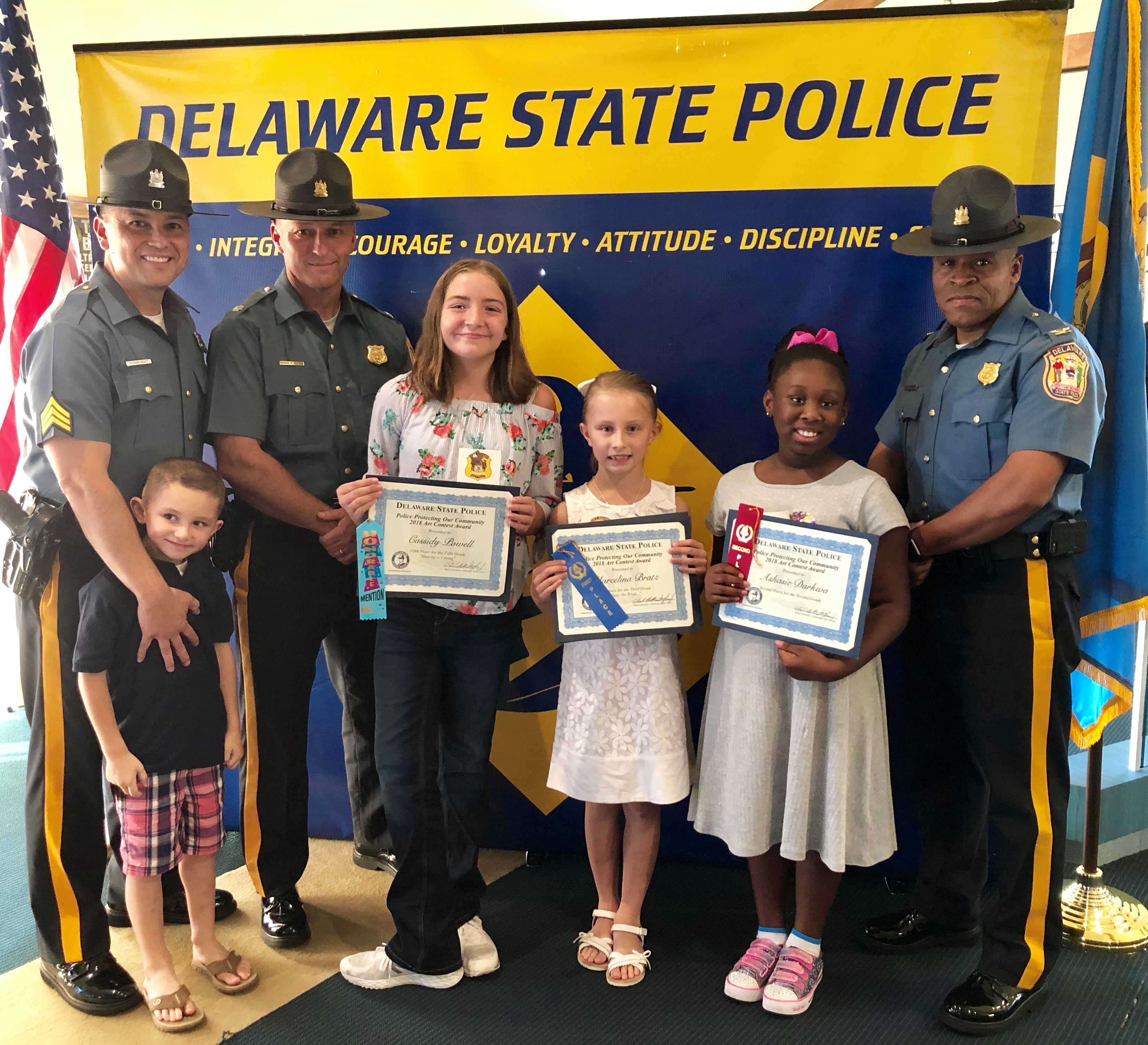 The honorary speaker was our Superintendent of the Delaware State Police, Colonel Nathaniel McQueen Jr. Also those in attendance were Deputy Superintendent, Lieutenant Colonel Monroe Hudson and members of the Delaware State Police Community Outreach Unit. Additionally, several family members and friends of the honored students came out to support the event. Their artwork will be humbly displayed at the Delaware State Police Museum. If you missed the ceremony checkout our Facebook live post of the event on August 9th, 2018.