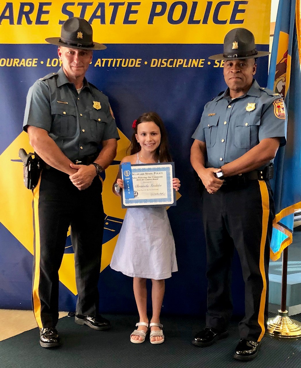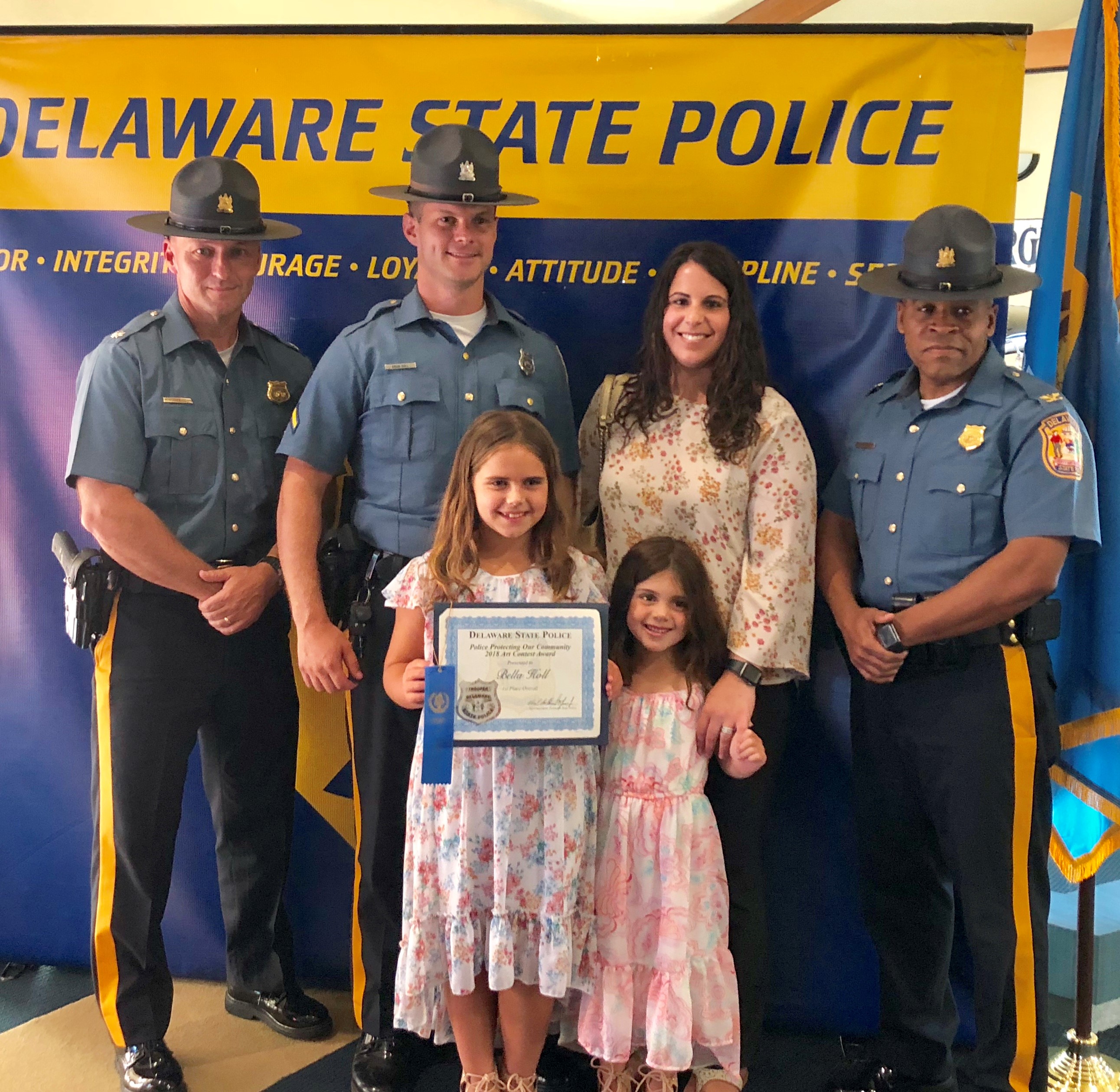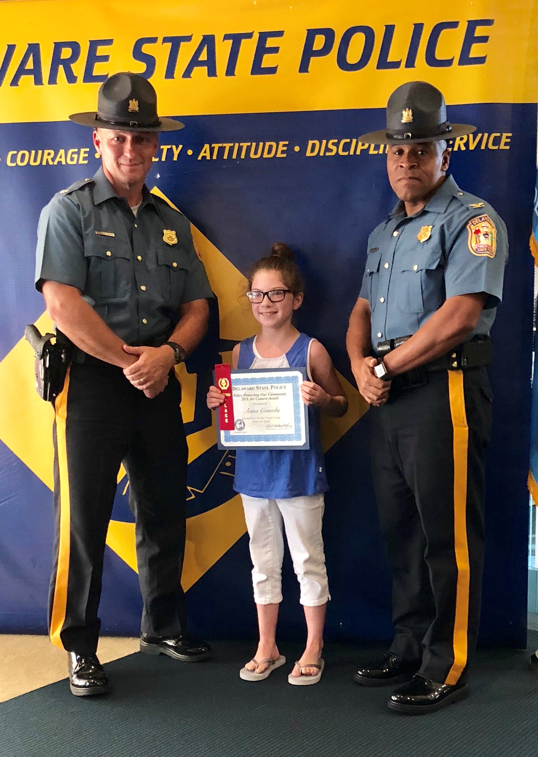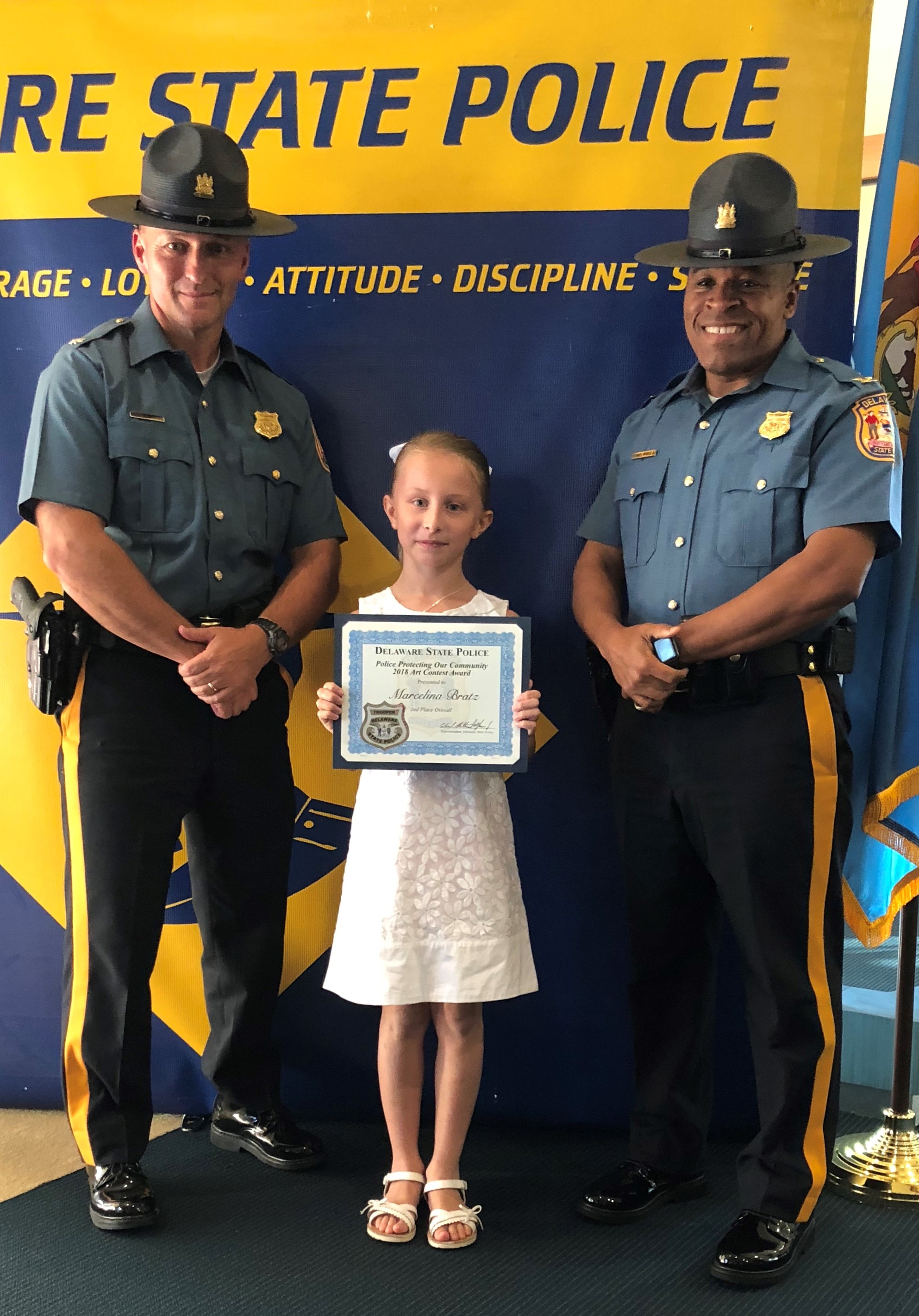 The honorary speaker was our Superintendent of the Delaware State Police, Colonel Nathaniel McQueen Jr. Also those in attendance were Deputy Superintendent, Lieutenant Colonel Monroe Hudson and members of the Delaware State Police Community Outreach Unit. Additionally, several family members and friends of the honored students came out to support the event. Their artwork will be humbly displayed at the Delaware State Police Museum. If you missed the ceremony checkout our Facebook live post of the event on August 9th, 2018.