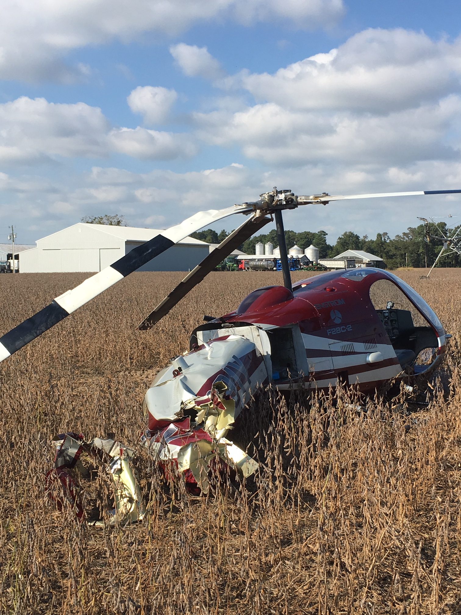The preliminary investigation thus far has determined the crash occurred today, Sunday, October 7, 2018 at approximately 1:37 p.m. when a 1981 Enstrom FA28C with approximately 15 gallons fuel on board took off from behind the Evans Farms Fall Festival. The pilot, 62 of Bridgeville, reported the aircraft lost power as he cleared the irrigation and electrical lines and proceeded east approximately 300 yards before making a hard landing into the adjacent soybean field.