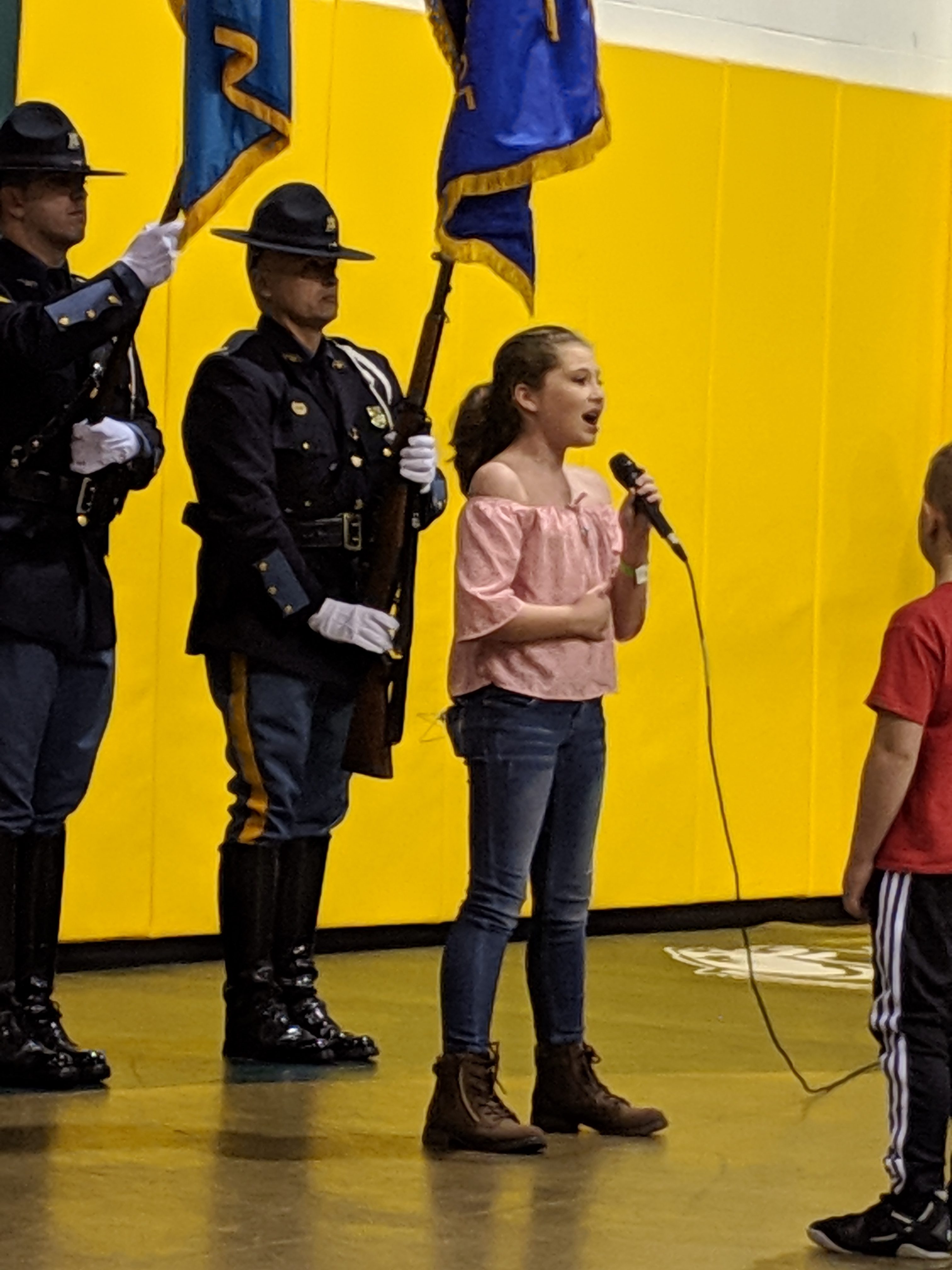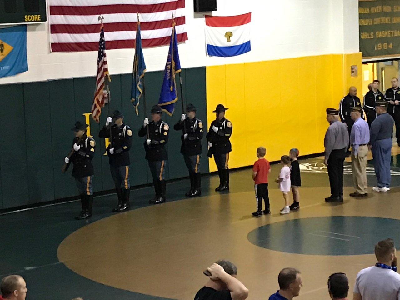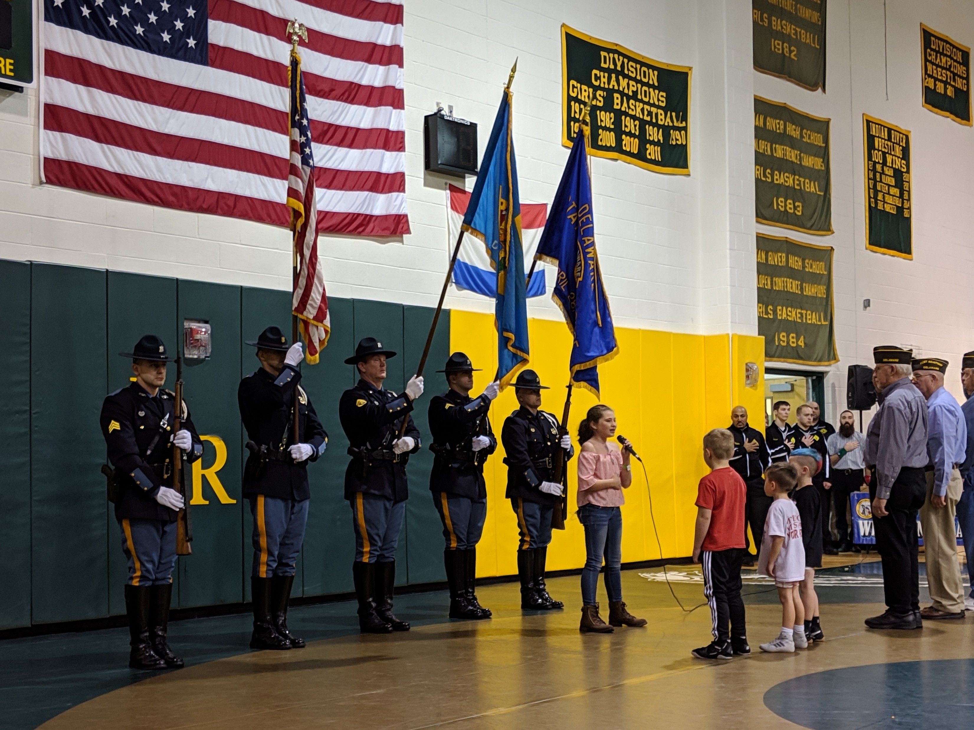 Sussex County, Delaware – This once-a-year wrestling tournament was held at the Indian River High School located in Dagsboro, Delaware. Families from Delaware and several surrounding states came for this awesome opportunity to compete. The Delaware State Police Honor Guard commanded by Captain Jason Sapp presented the colors to begin the event. The National Anthem was performed by Adria Windish, daughter of Lieutenant Gerald & Lynn Windish.