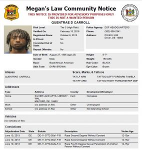 Dover– The following subject is not wanted. This is a Homeless Sex Offender Public Notification. If you have information that the listed subject is occupying a residence, please call 302-672-5306. Information may also be provided by calling Delaware Crime Stoppers at 1-800-TIP-3333, via the internet at http://www.delaware.crimestoppersweb.com.
