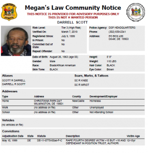 Dover– The following subject is not wanted. This is a Homeless Sex Offender Public Notification. If you have information that the listed subject is occupying a residence, please call 302-672-5306. Information may also be provided by calling Delaware Crime Stoppers at 1-800-TIP-3333, via the internet at http://www.delaware.crimestoppersweb.com.