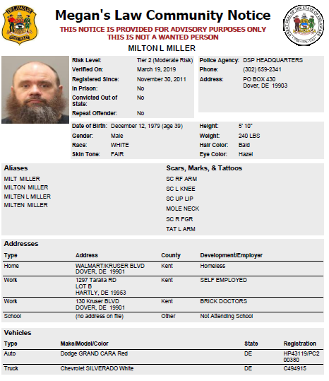 Dover– The following subjects are not wanted. This is a Homeless Sex Offender Public Notification. If you have information that the listed subjects are occupying a residence, please call 302-672-5306. Information may also be provided by calling Delaware Crime Stoppers at 1-800-TIP-3333, via the internet at http://www.delaware.crimestoppersweb.com.