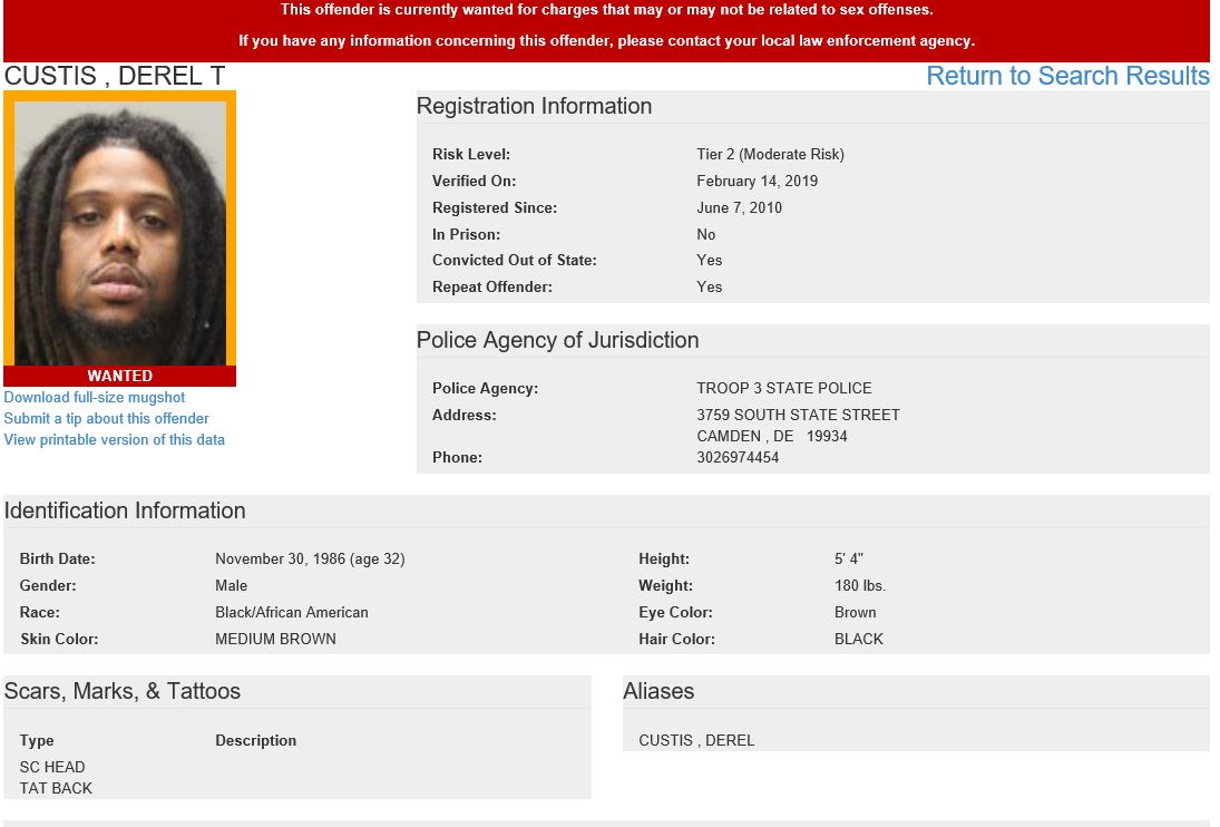 Dover, DE- The Delaware State Police Sex Offender Apprehension and Registration Unit (S.O.A.R) is currently looking for the following wanted sex offender after he either failed to register or re-register their current address. If anyone knows the location of these subjects, they are asked to call 302-672-5306. Information may also be provided by calling Delaware Crime Stoppers at 1-800-TIP-3333, via the http://www.delaware.crimestoppersweb.com/