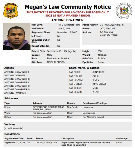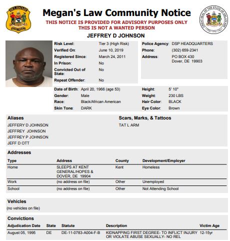 Dover– The following subjects are not wanted. This is a Homeless Sex Offender Public Notification. If you have information that the listed subjects are occupying a residence, please call 302-672-5306. Information may also be provided by calling Delaware Crime Stoppers at 1-800-TIP-3333, via the internet at http://www.delaware.crimestoppersweb.com.