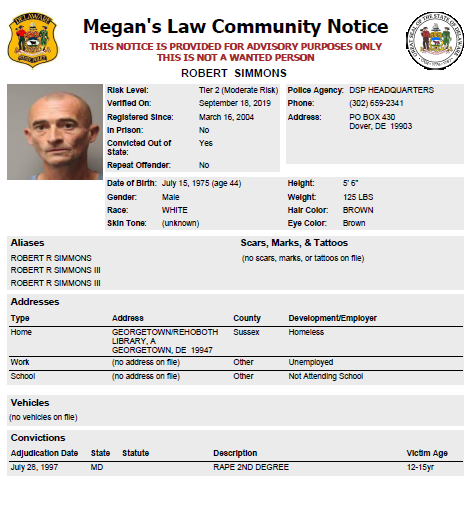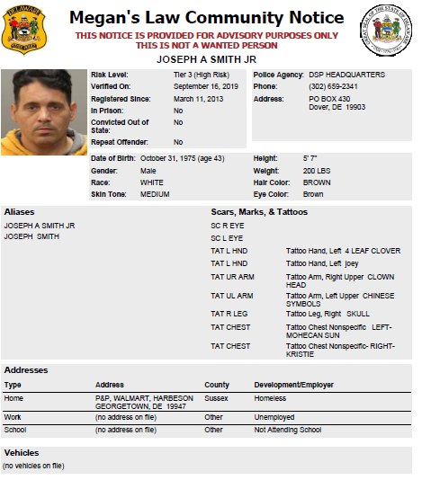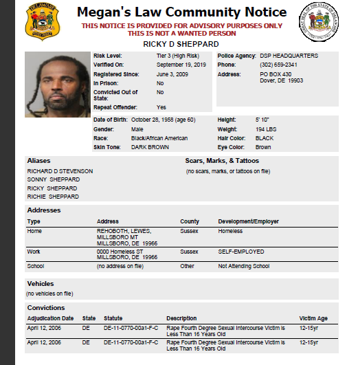 Dover– The following subjects are not wanted. This is a Homeless Sex Offender Public Notification. If you have information that the listed subjects are occupying a residence, please call 302-672-5306. Information may also be provided by calling Delaware Crime Stoppers at 1-800-TIP-3333, via the internet at http://www.delaware.crimestoppersweb.com.