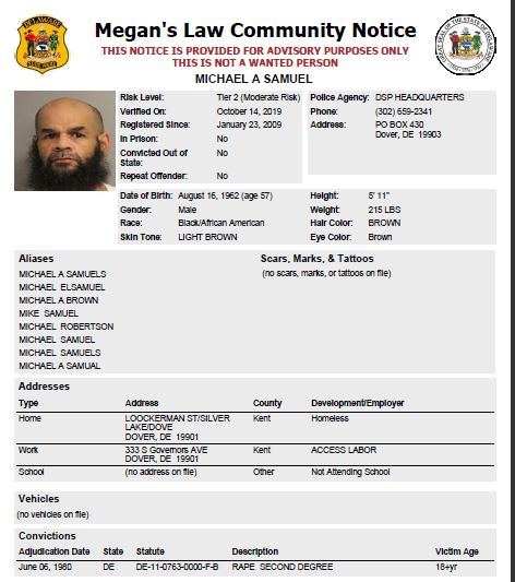 Dover– The following subjects are not wanted. This is a Homeless Sex Offender Public Notification. If you have information that the listed subjects are occupying a residence, please call 302-672-5306. Information may also be provided by calling Delaware Crime Stoppers at 1-800-TIP-3333, via the internet at http://www.delaware.crimestoppersweb.com.