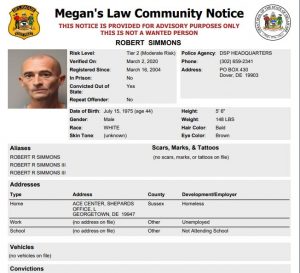 Dover– The following subjects not wanted. This is a Homeless Sex Offender Public Notification. If you have information that the listed subjects are occupying a residence, please call 302-672-5306. Anyone with information in reference to the whereabouts of Robert Simmons is asked to please contact Detective M. Bailey at 302-943-1560. Information may also be provided by calling Delaware Crime Stoppers at 1-800-TIP-3333, via the internet at http://www.delaware.crimestoppersweb.com.