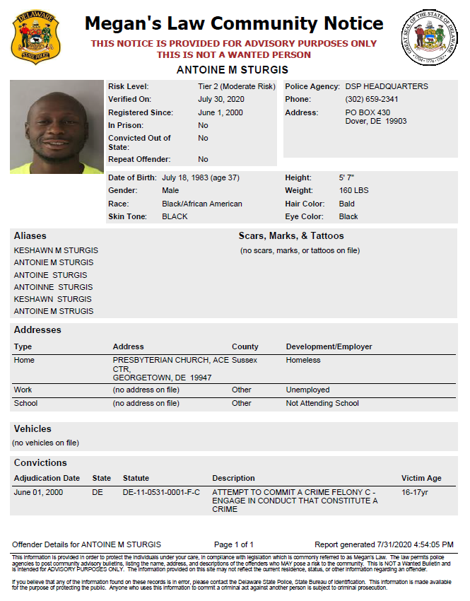 Dover– The following subjects are not wanted. This is a Homeless Sex Offender Public Notification. If you have information that the listed subjects are occupying a residence, please call 302-672-5306. Information may also be provided by calling Delaware Crime Stoppers at 1-800-TIP-3333, via the internet at http://www.delaware.crimestoppersweb.com.