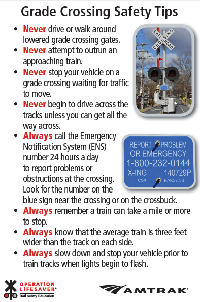 - Never drive or walk around lowered grade crossing gates.