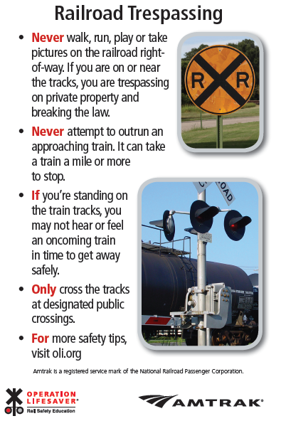 - Never walk, run, play or take pictures on the railroad right-of-way. If you are on or near the tracks, you are trespassing on private property and breaking the law.
