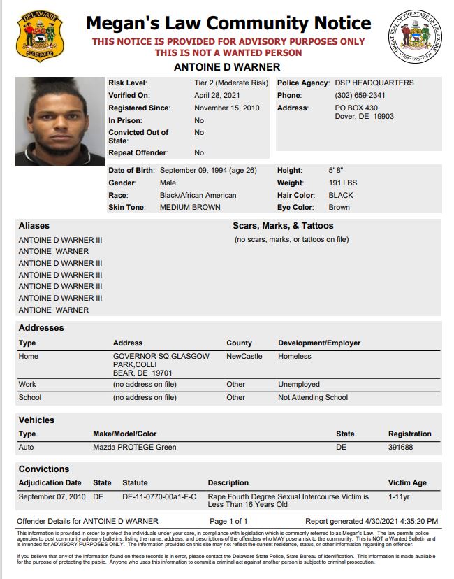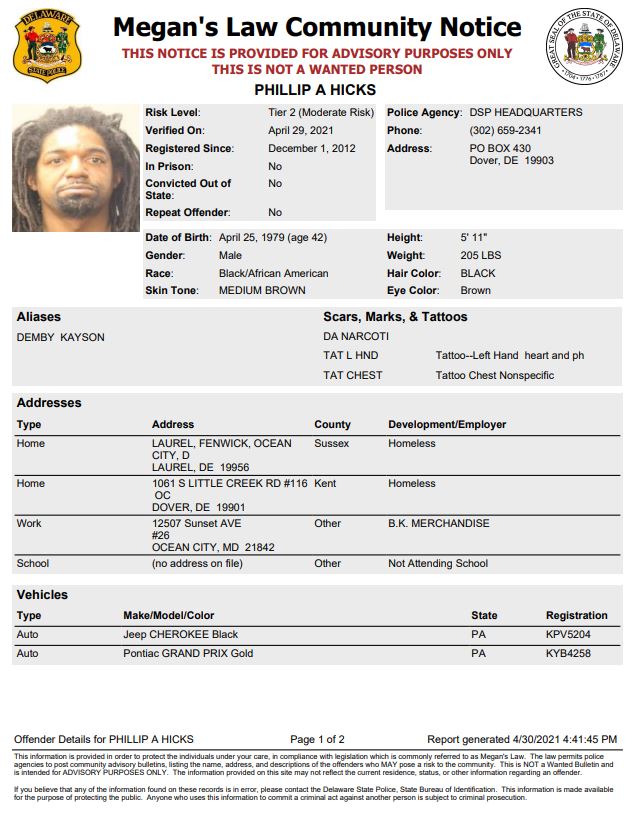 Dover– The following subjects are not wanted. This is a Homeless Sex Offender Public Notification. If you have information that the listed subjects are occupying a residence, please call 302-672-5306. Information may also be provided by calling Delaware Crime Stoppers at 1-800-TIP-3333, via the internet at http://www.delaware.crimestoppersweb.com.