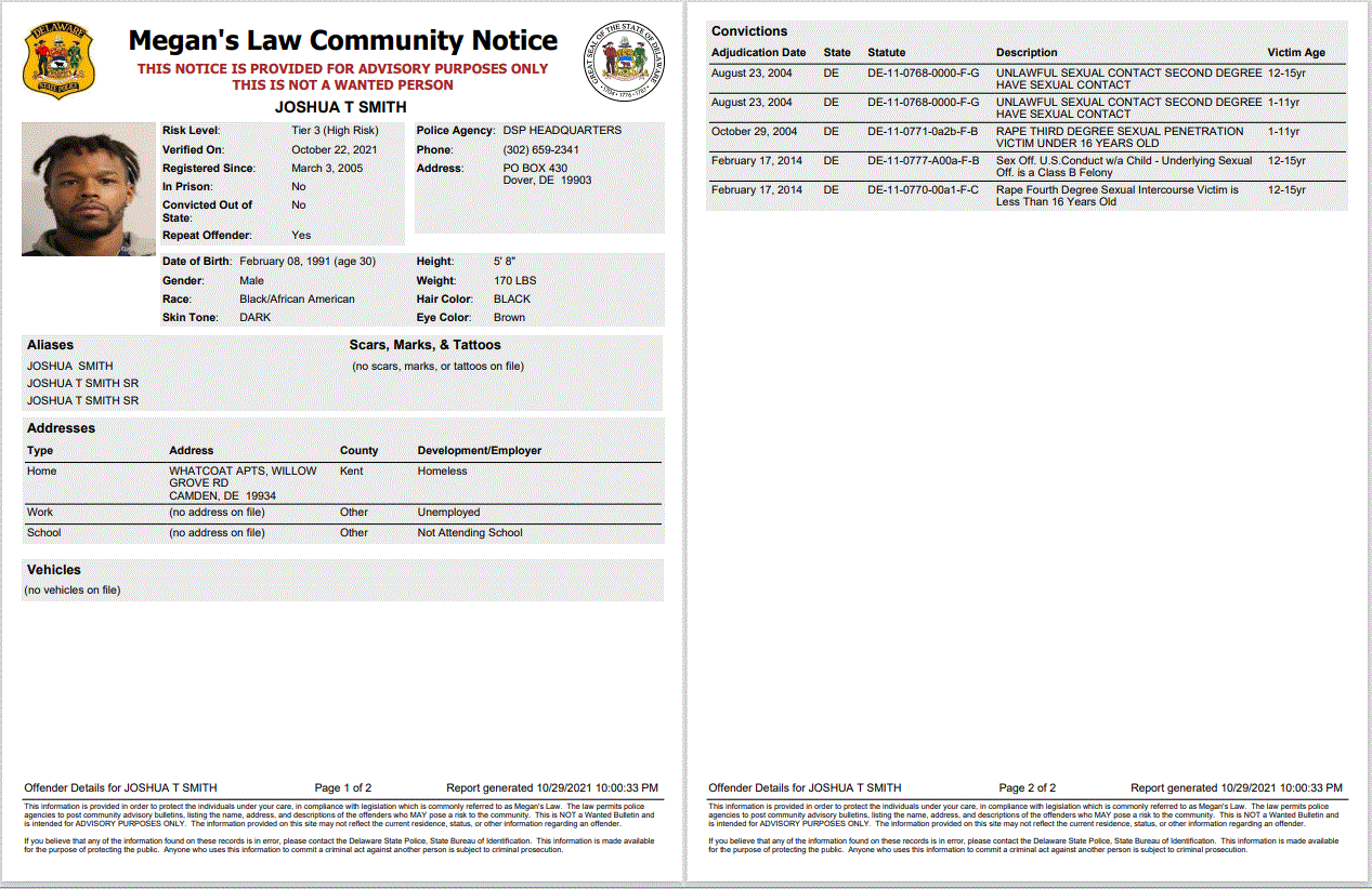 Dover– The following subjects are not wanted. This is a Homeless Sex Offender Public Notification. If you have information that the listed subjects are occupying a residence, please call 302-672-5306. Information may also be provided by calling Delaware Crime Stoppers at 1-800-TIP-3333, via the internet at http://www.delaware.crimestoppersweb.com.
