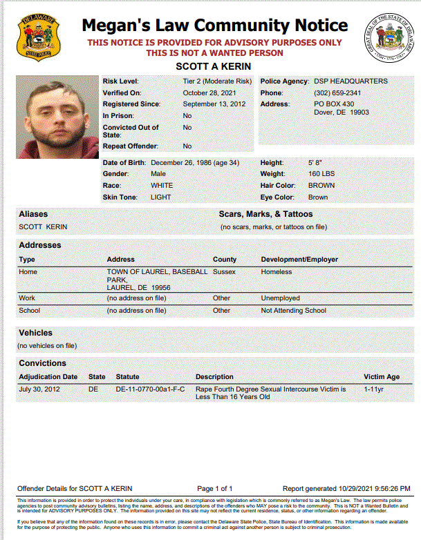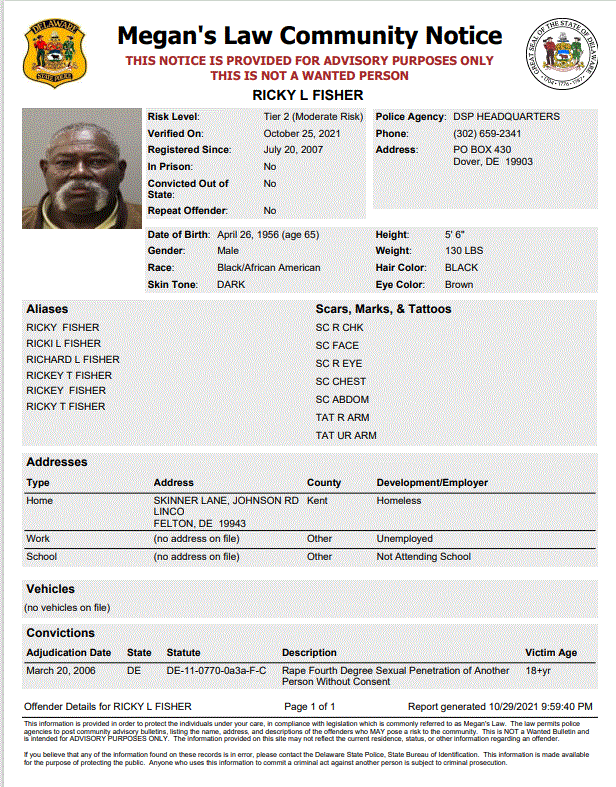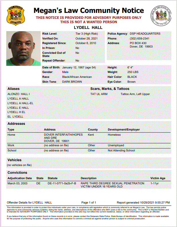 Dover– The following subjects are not wanted. This is a Homeless Sex Offender Public Notification. If you have information that the listed subjects are occupying a residence, please call 302-672-5306. Information may also be provided by calling Delaware Crime Stoppers at 1-800-TIP-3333, via the internet at http://www.delaware.crimestoppersweb.com.