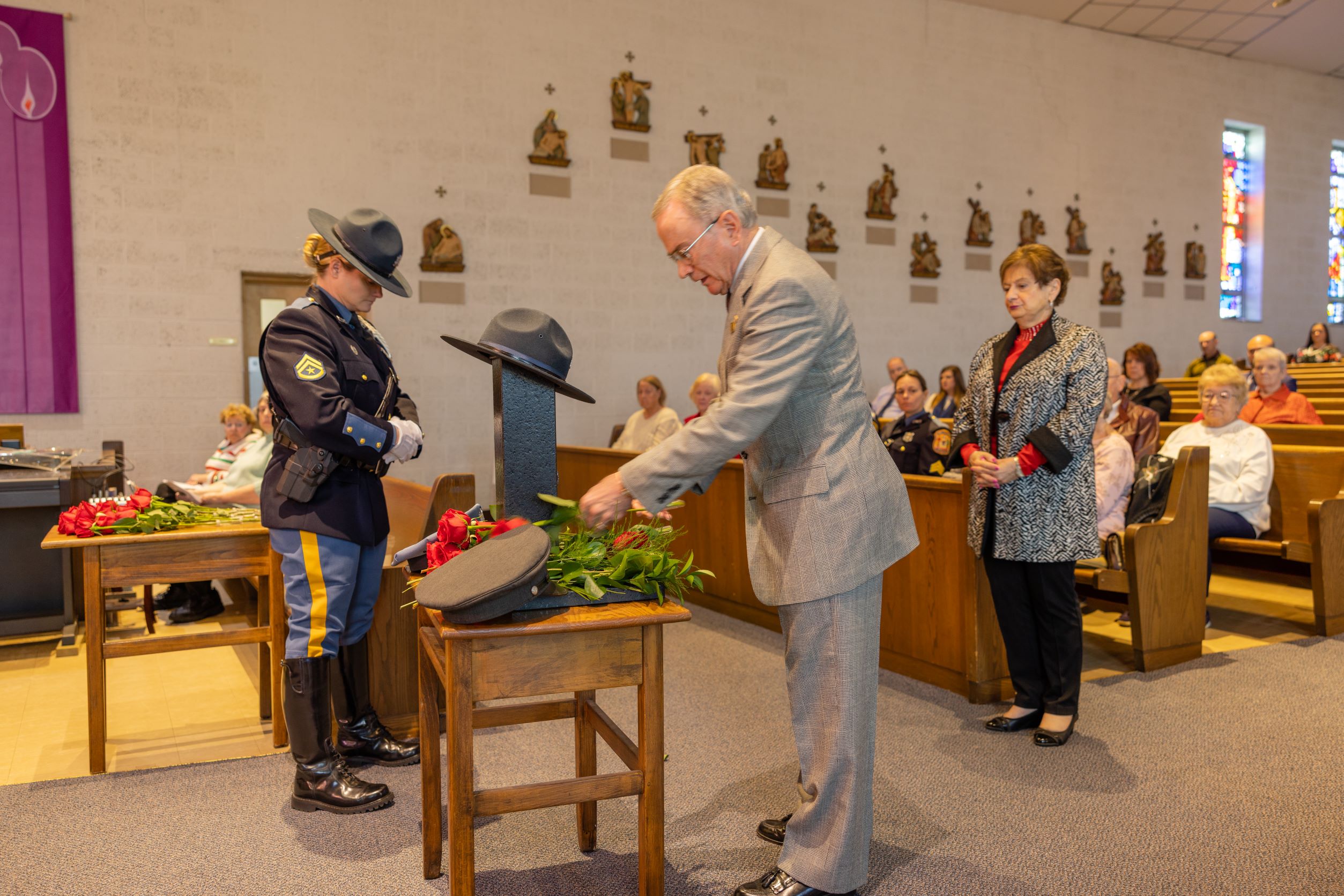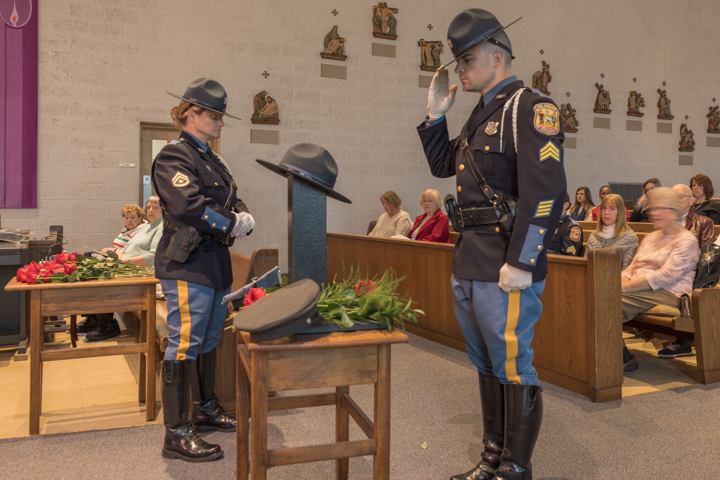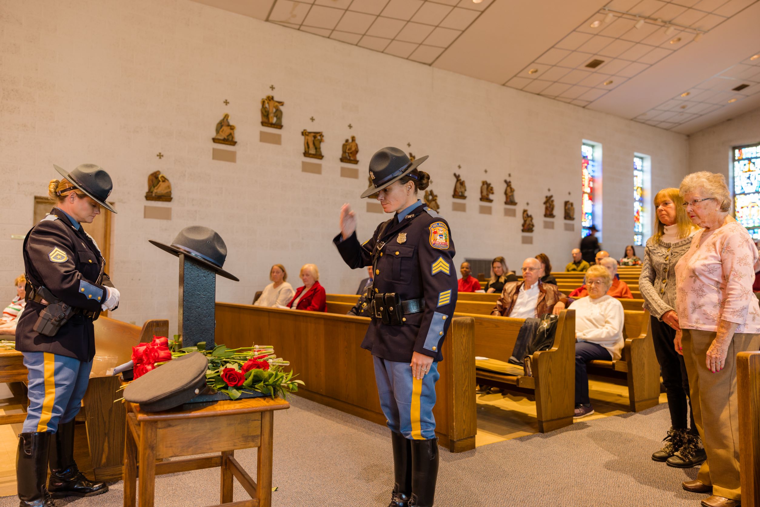 During the Heroes’ Roll Call, the families and friends of the fallen troopers placed a single rose in remembrance of their loved one on a table that held a campaign hat – a revered symbol of all Delaware State Troopers.