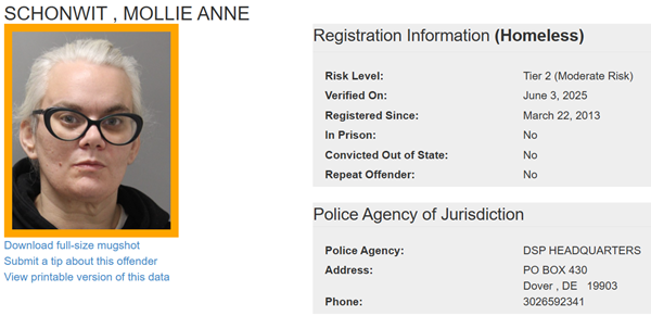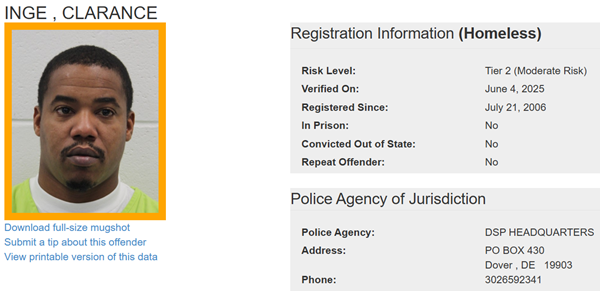 The following individuals are not wanted for failing to register or re-register at their current address. This is a Homeless Sex Offender Public Notification. If you have information that the listed individuals are occupying a residence, please call 302-672-5306. Information may also be provided by contacting Delaware Crime Stoppers at 1-800-847-3333.