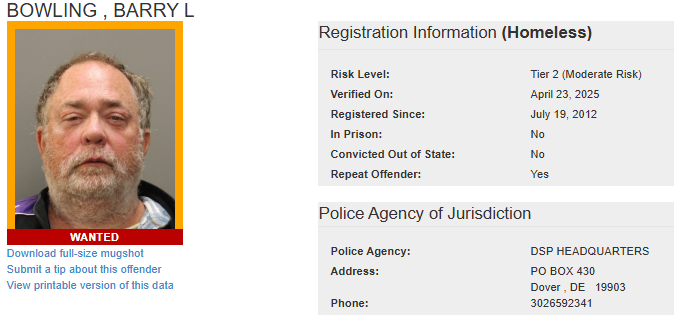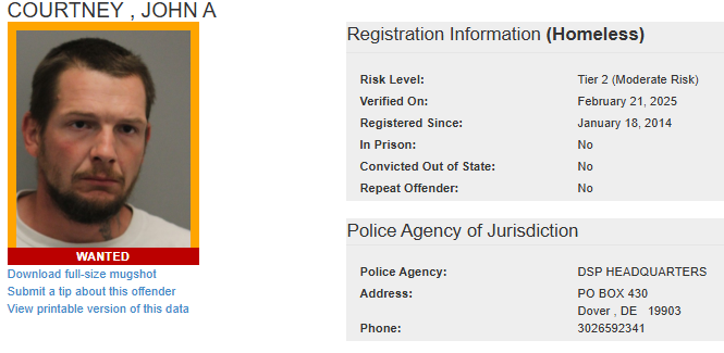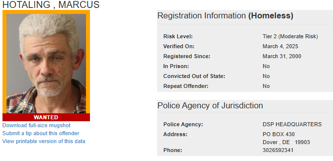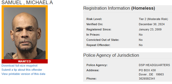 The Delaware State Police Sex Offender Apprehension and Registration Unit (S.O.A.R.) is currently looking for the following wanted sex offenders after they either failed to register or re-register at their current address. If anyone knows the location of these individuals, please call 302-672-5306. Information may also be provided by contacting Delaware Crime Stoppers at 1-800-847-3333.